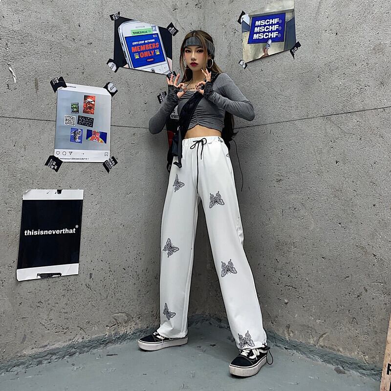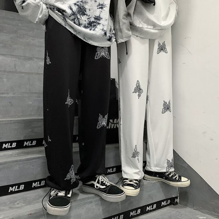 ブラックホワイトプリント柄パンツ レディースストレッチウェストルーズハイウェストButterflyデザイン カジュアル夏服 エラスティック 伸縮 夏物 ウエスト CHIL34998976424