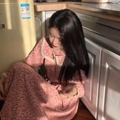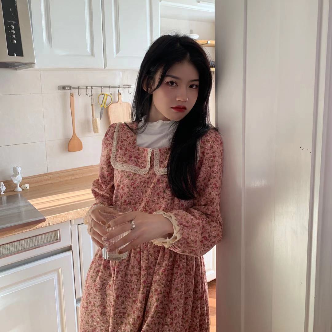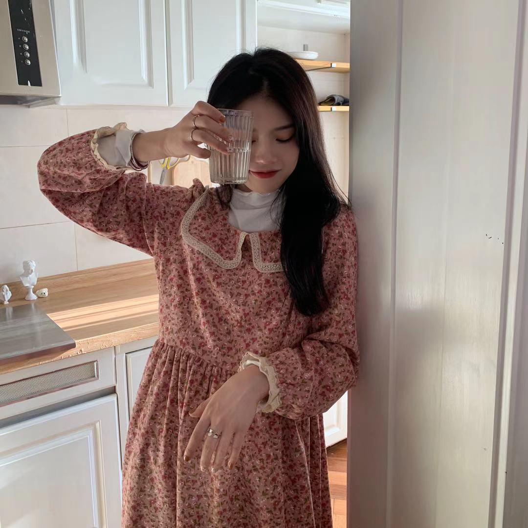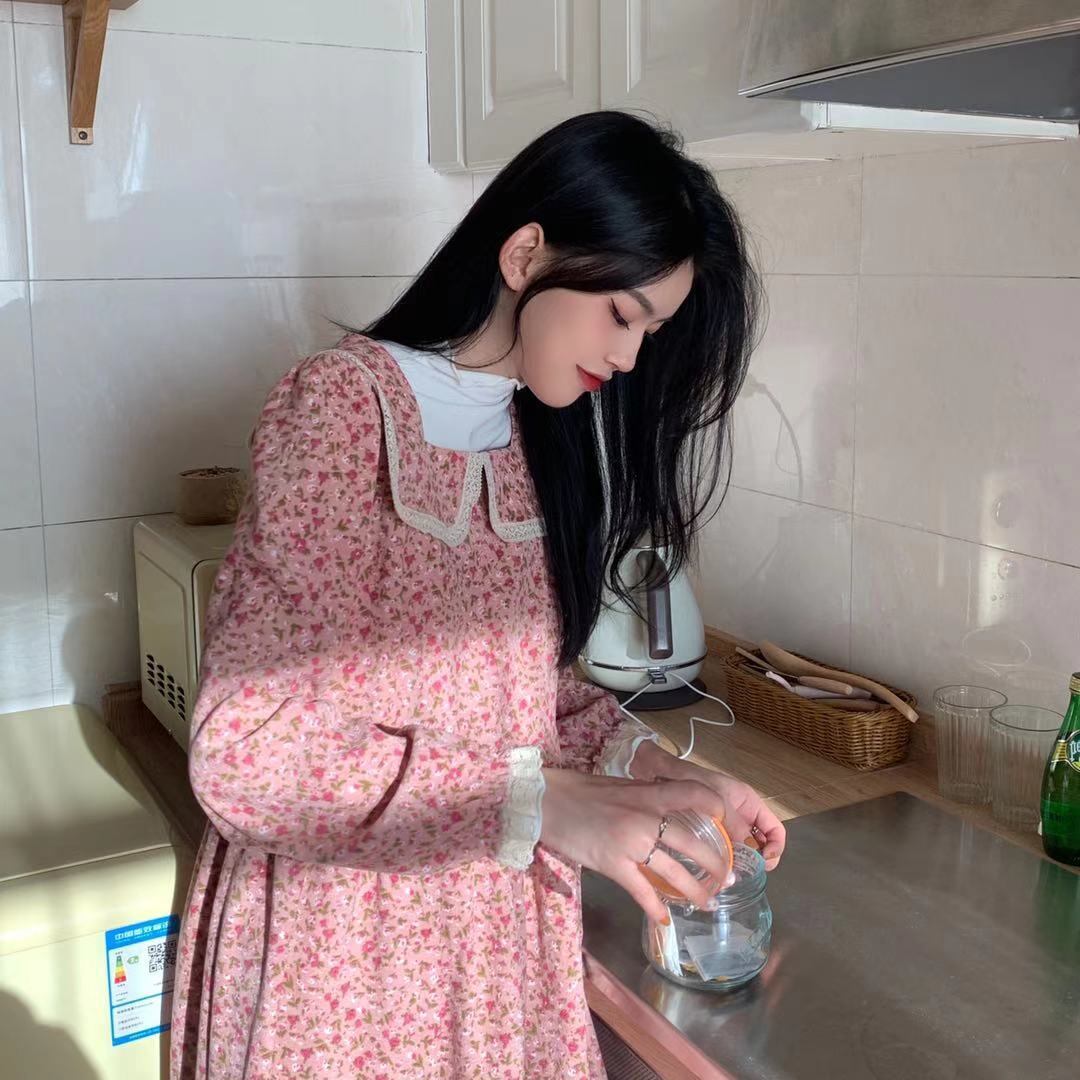 スタンダードスタイルコーデュロイフローラルロングワンピースレディース ピンク レトロ 大人ガーリー スウィート キュート カジュアル 花柄 CHIL18816768516