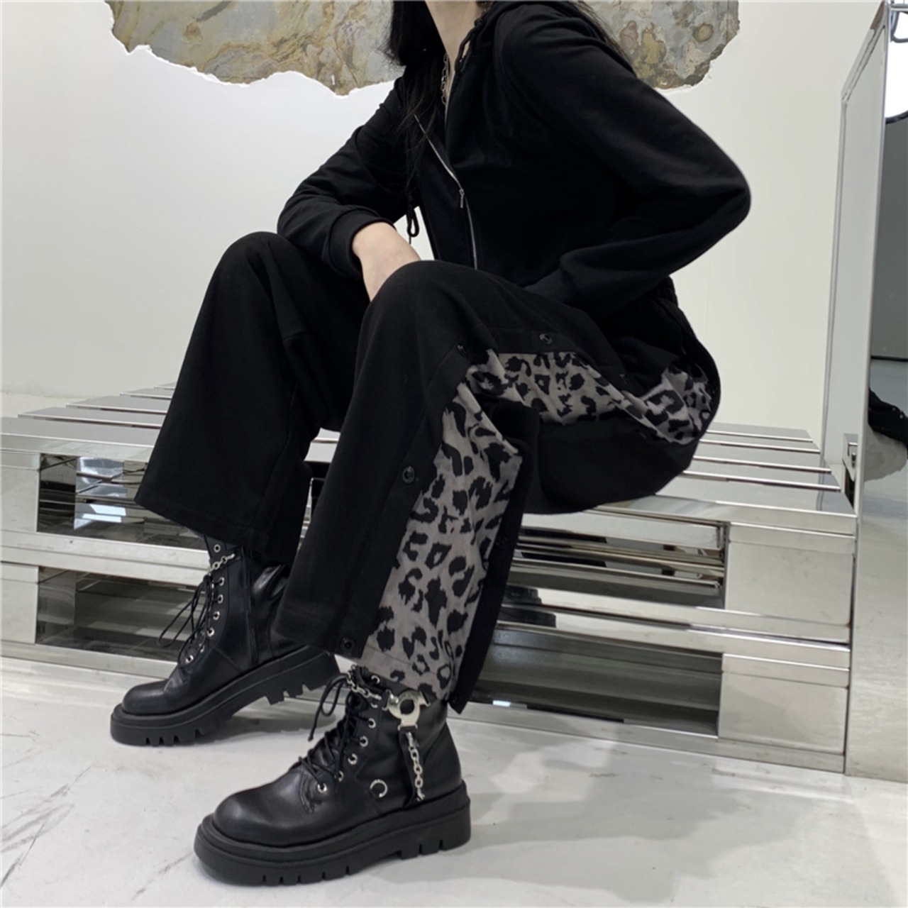 トレンドボタンレオパードパターンハイウェストウェストルーズカジュアルパンツ ステッチ ウエスト CHIL40155888580