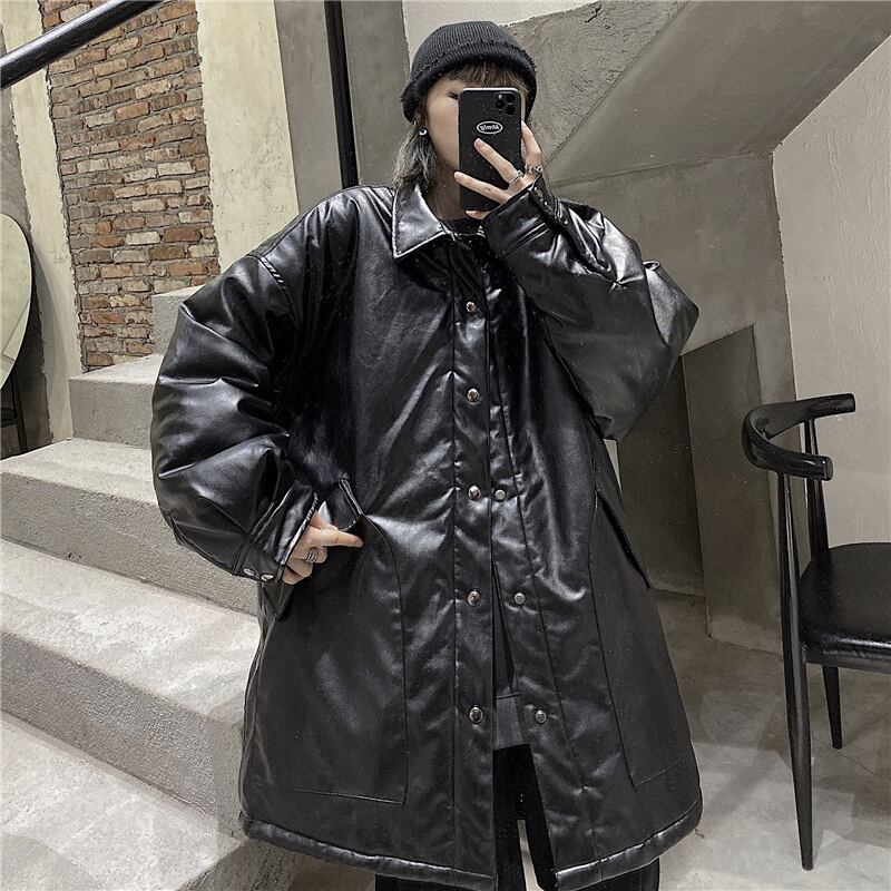 トレンドウィンタースタンダードレザージャケット レディースメンズルーズコート ブラック コットン レトロ 冬物 ミドル丈 CHIL53674874406