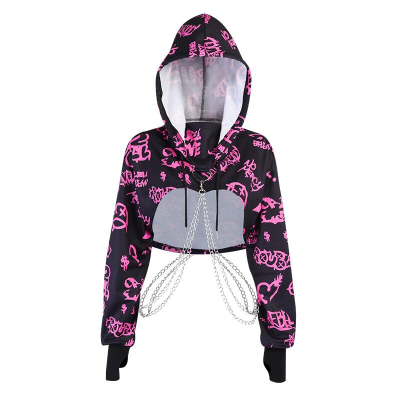 ダークプリント柄チェーン トップス トレンドセーター レディースルーズフード ロング ストリート 長袖 YU40528883023