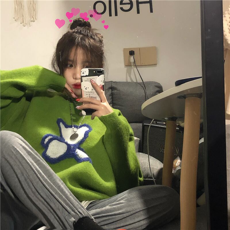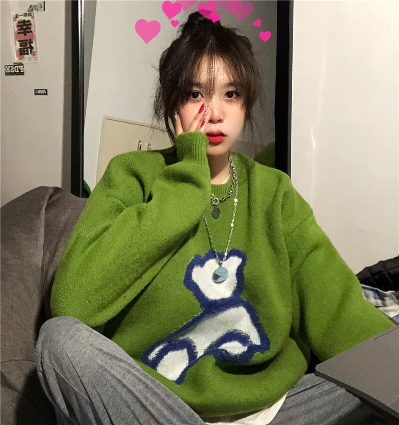 秋物ウィンターセーター レディース韓国ファッショントレンドルーズグリーンラウンドネックジャケット ロング オータム 冬物 Oネック スタイル 長袖 デーモン23112114439