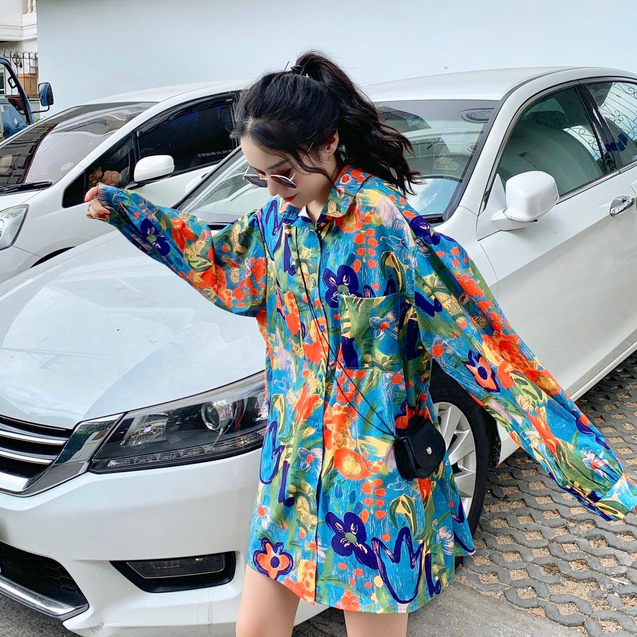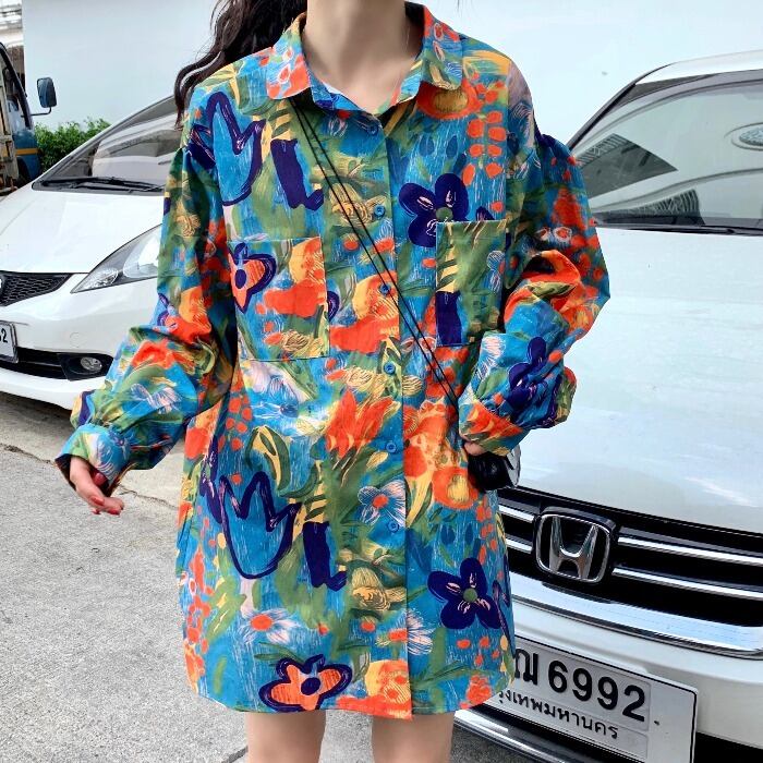 スプリングFlowerデザイン シャツ スカート レディーススタンダードルーズ ロング レトロ 春物 フラワーデザイン 長袖 ミドル丈 CHIL31082309814