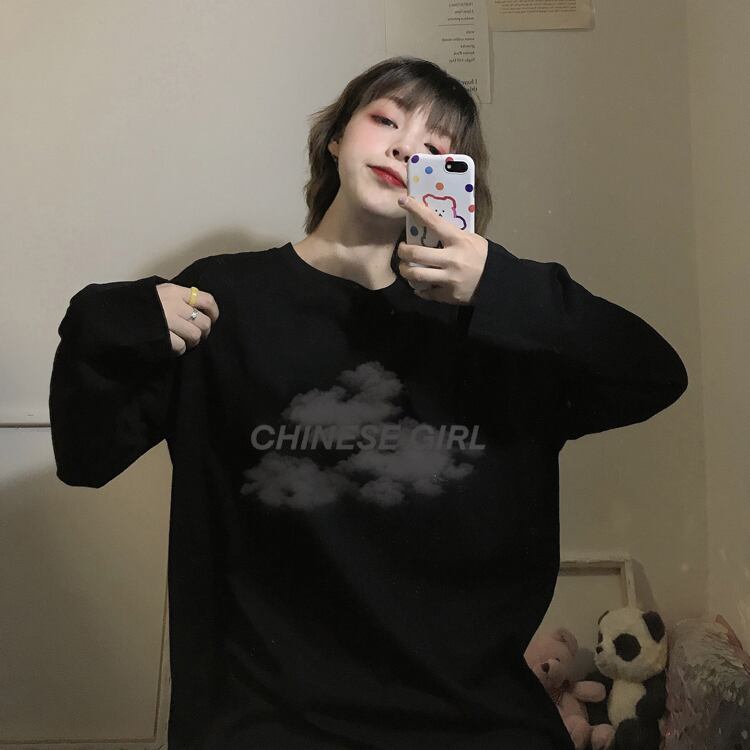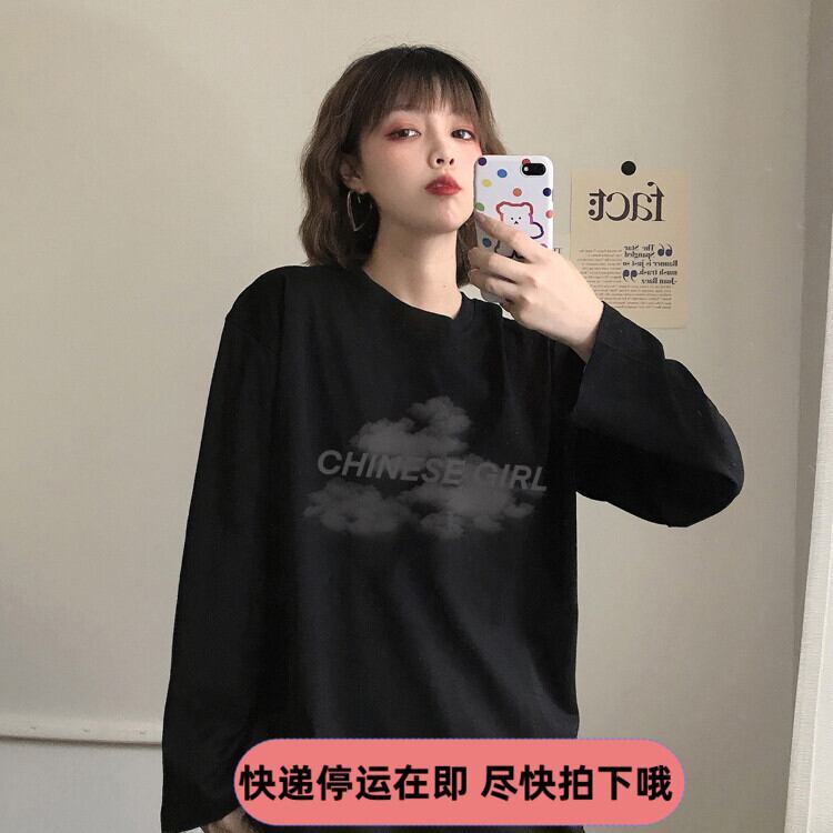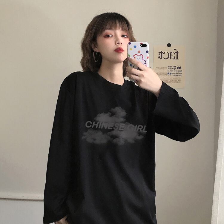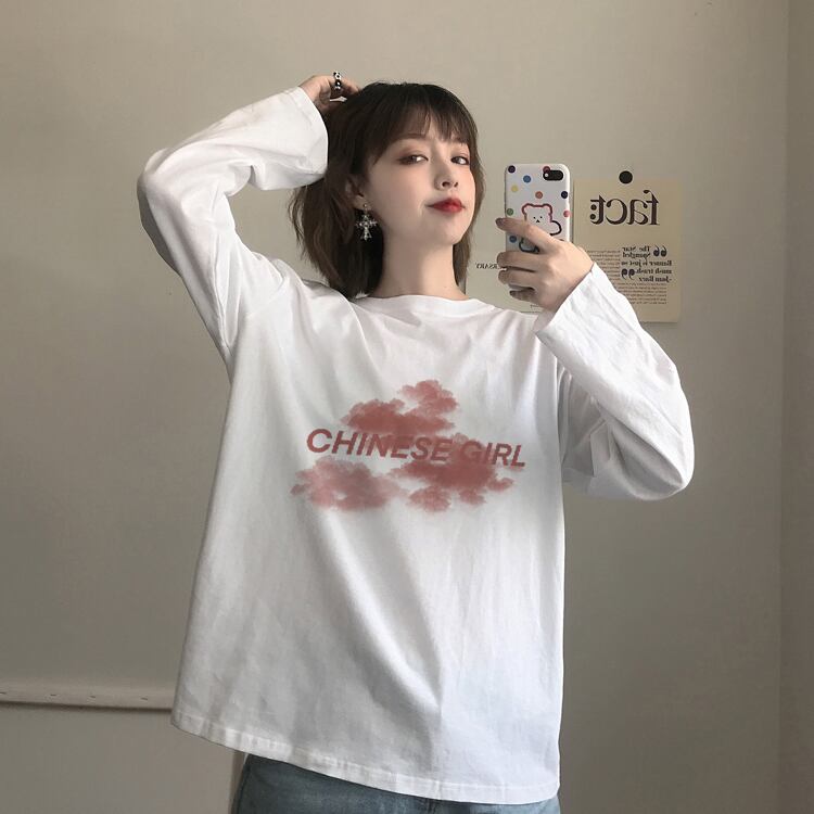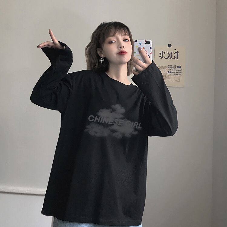 ラウンドネックTシャツシャツ レディーススプリングルーズゆったりプリントトップス ロング 春物 Oネック 長袖 CHIL55364889991