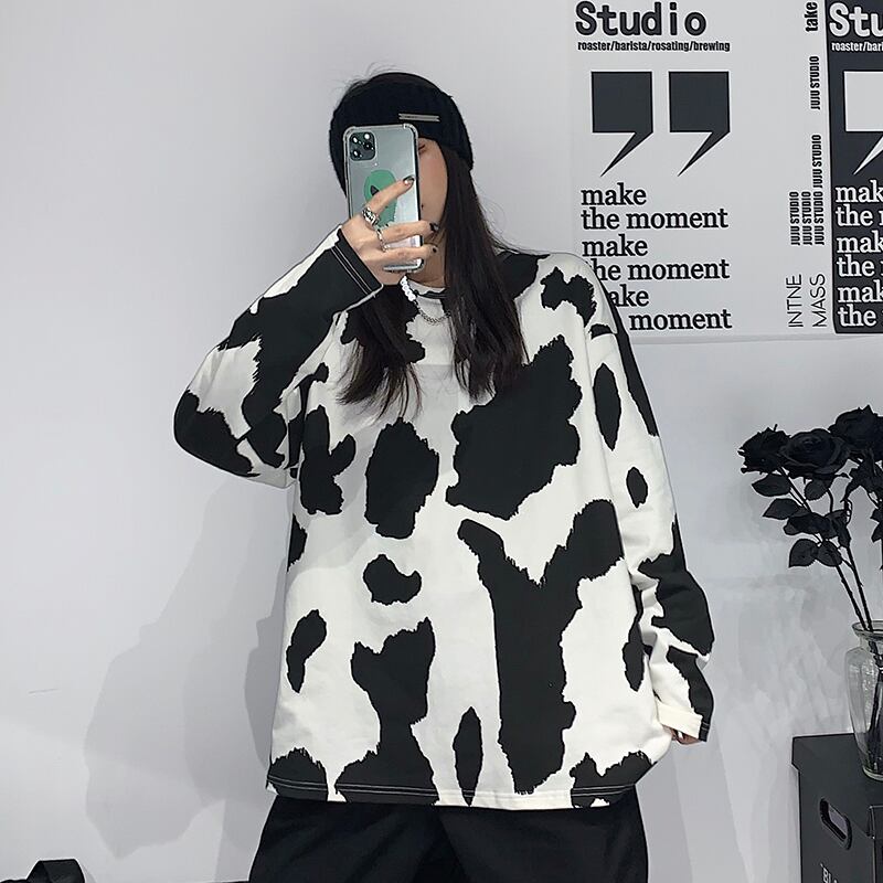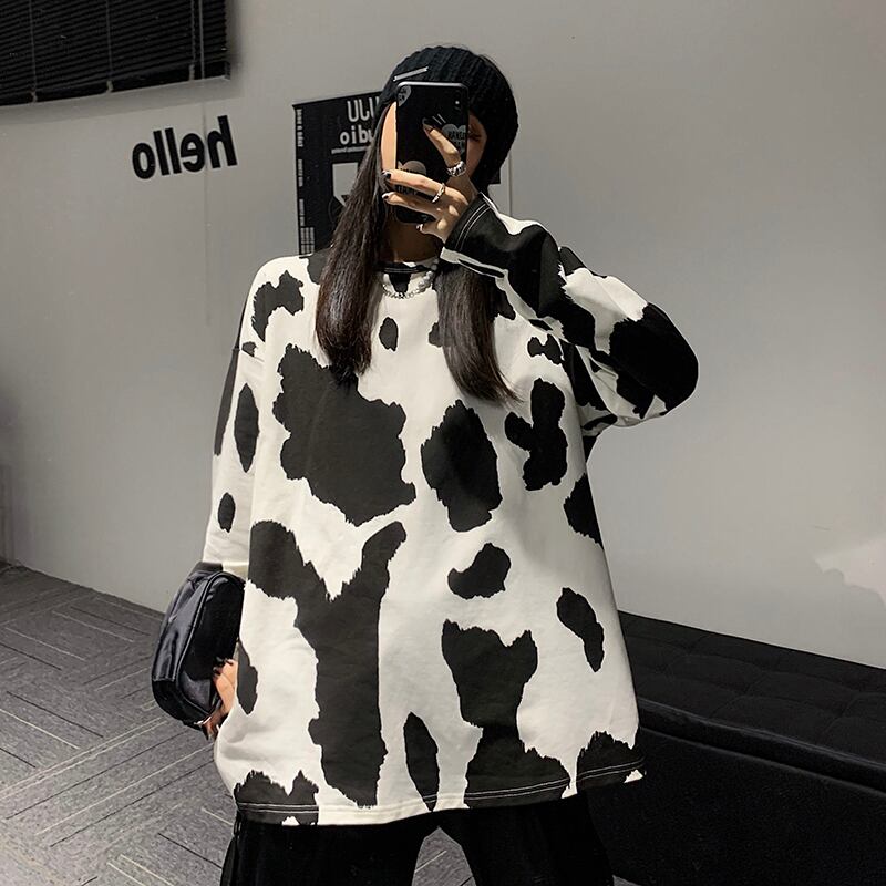 トレンドパターンプリントTシャツシャツ レディースルーズ韓国ファッションゆったり ロング スタイル 長袖 CHIL84030067704