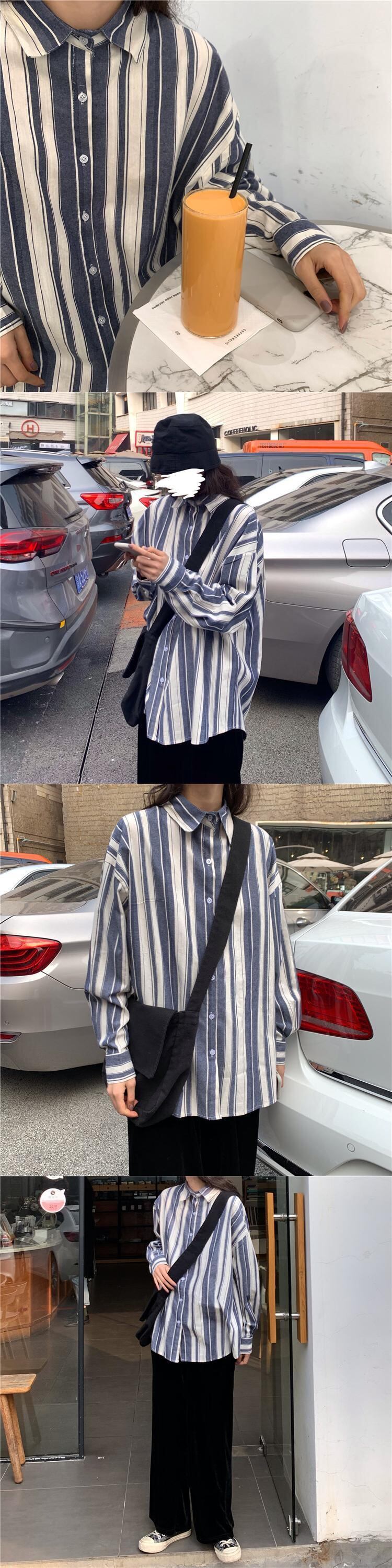 ストライプシャツ レディーススプリング秋物韓国ファッションスタンダードスタイルルーズゆったり長袖スリーブ ロング レトロ 春物 オータム CHIL87725545456