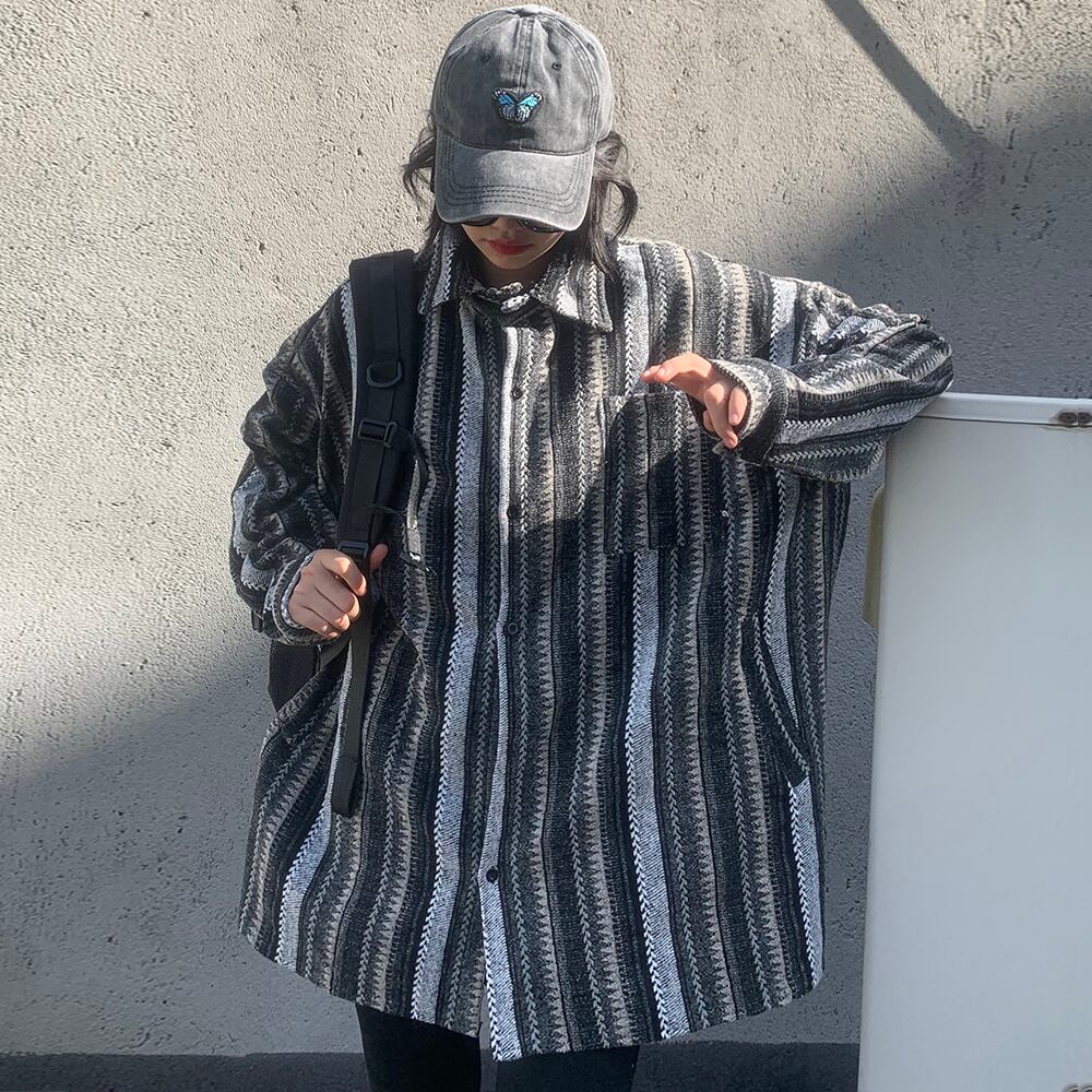 シャツ レディース秋物ウィンタースタイルスタンダードストライプルーズカジュアルジャケット ロング レトロ オータム 冬物 ボーイズ 長袖 デーモン99666771713