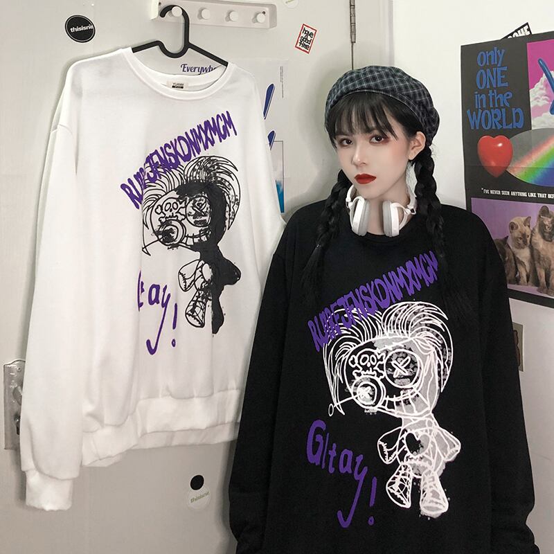 秋物ウィンターラウンドネックブラウス レディース韓国ファッショントレンドプリントルーズホワイトセーター ロング オータム 冬物 Oネック ボーイズ スタイル 長袖 デーモン8454504091