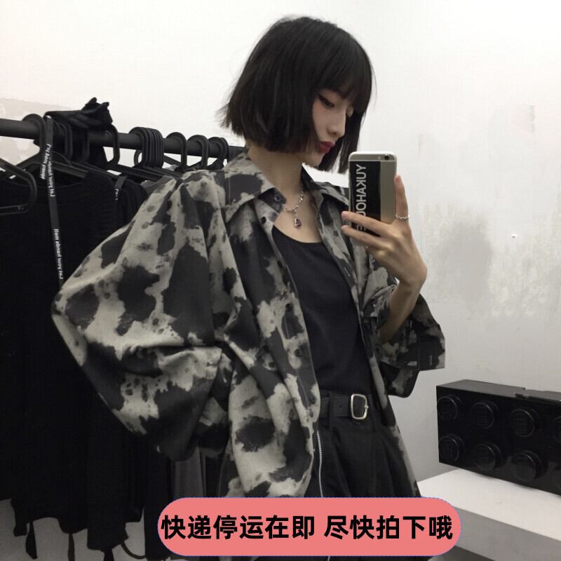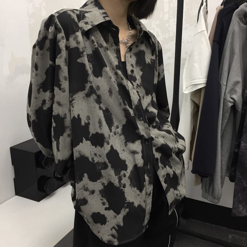 シャツ スプリングスタイルスタンダードブラックグレーレオパードプリント柄ブラウス ロング レトロ 原宿 春物 長袖 CHIL90665506404