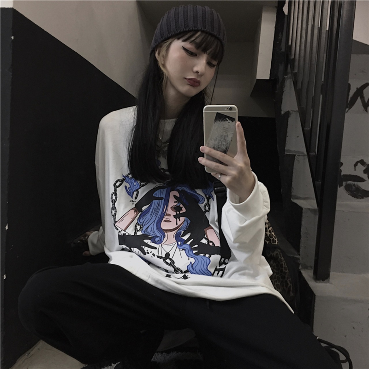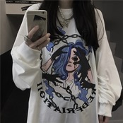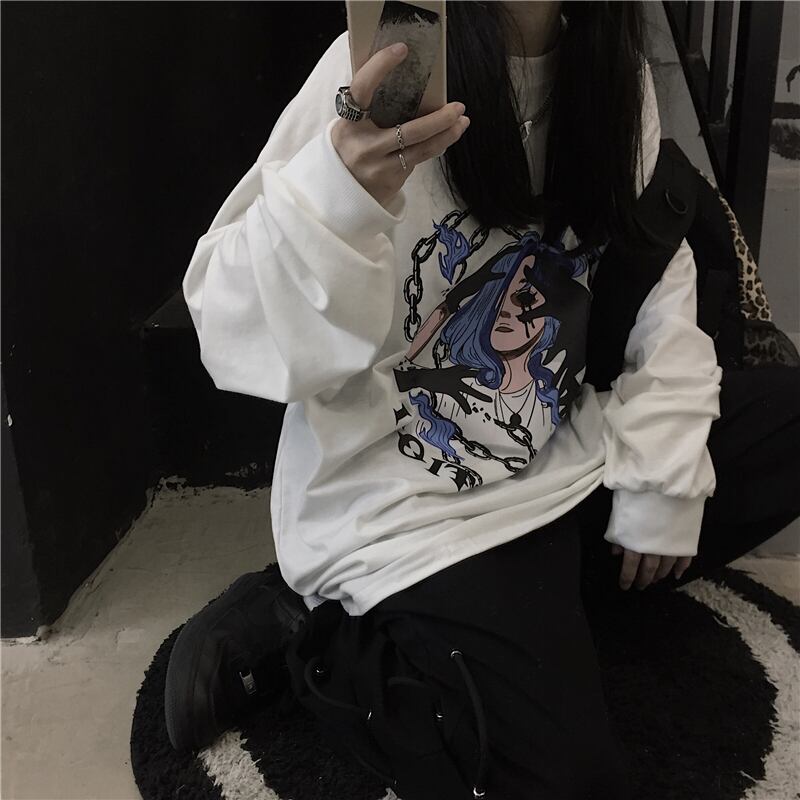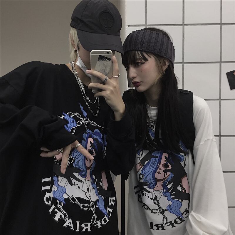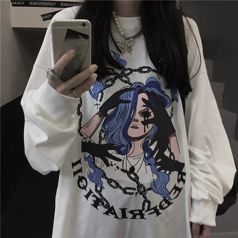 スプリングレディース韓国ファッションダークトレンドプリントルーズTシャツトップス メンズ ロング 春物 スタイル 長袖 CHIL92416335379
