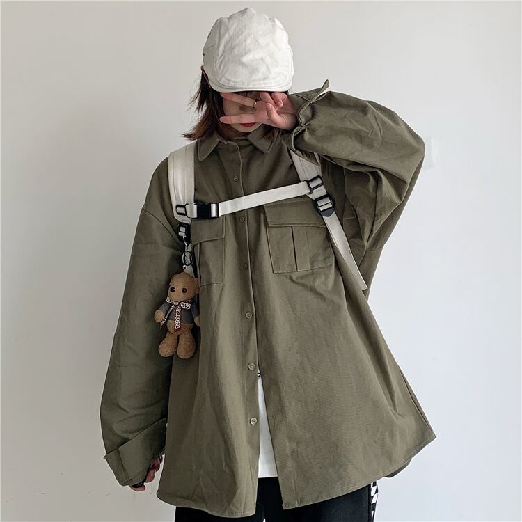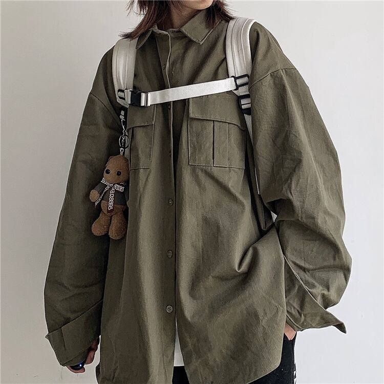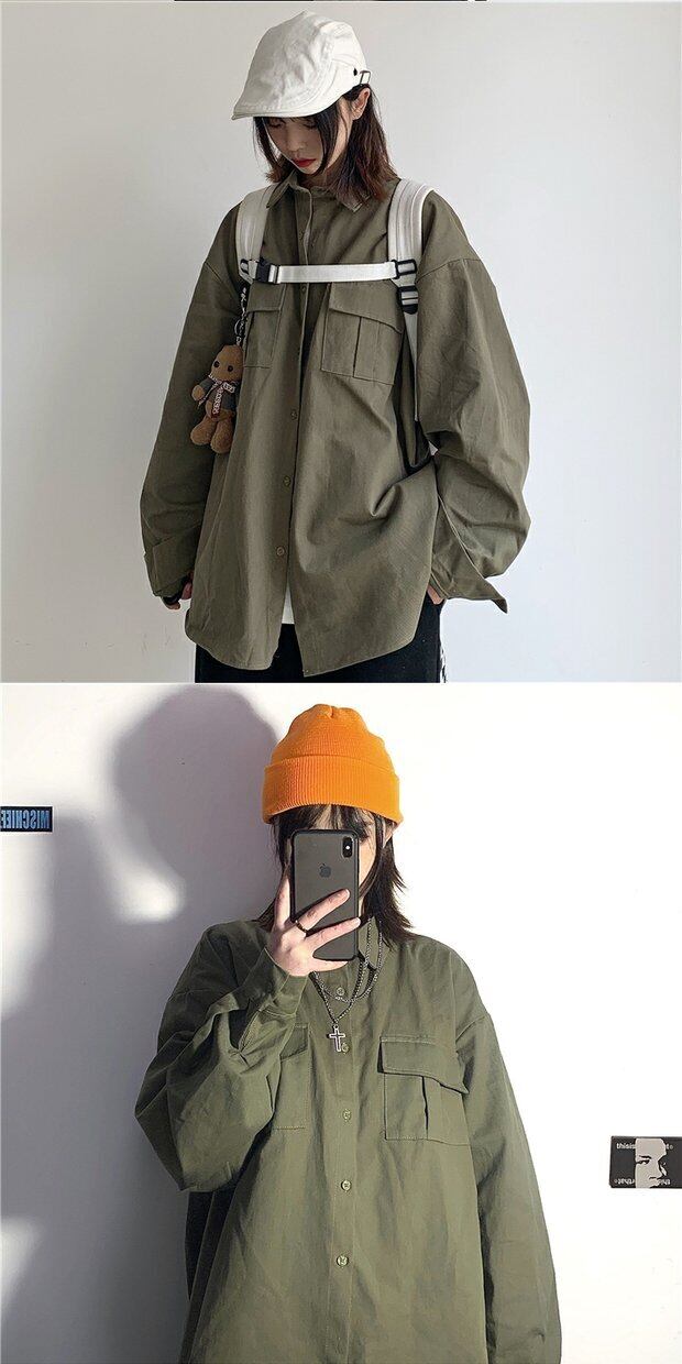 シャツ レディーススプリング韓国ファッションスタンダードカジュアルルーズグリーンジャケット ロング レトロ 春物 長袖 デーモン49714681891