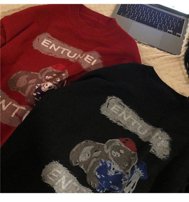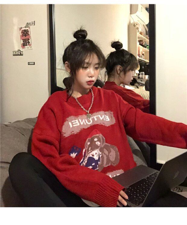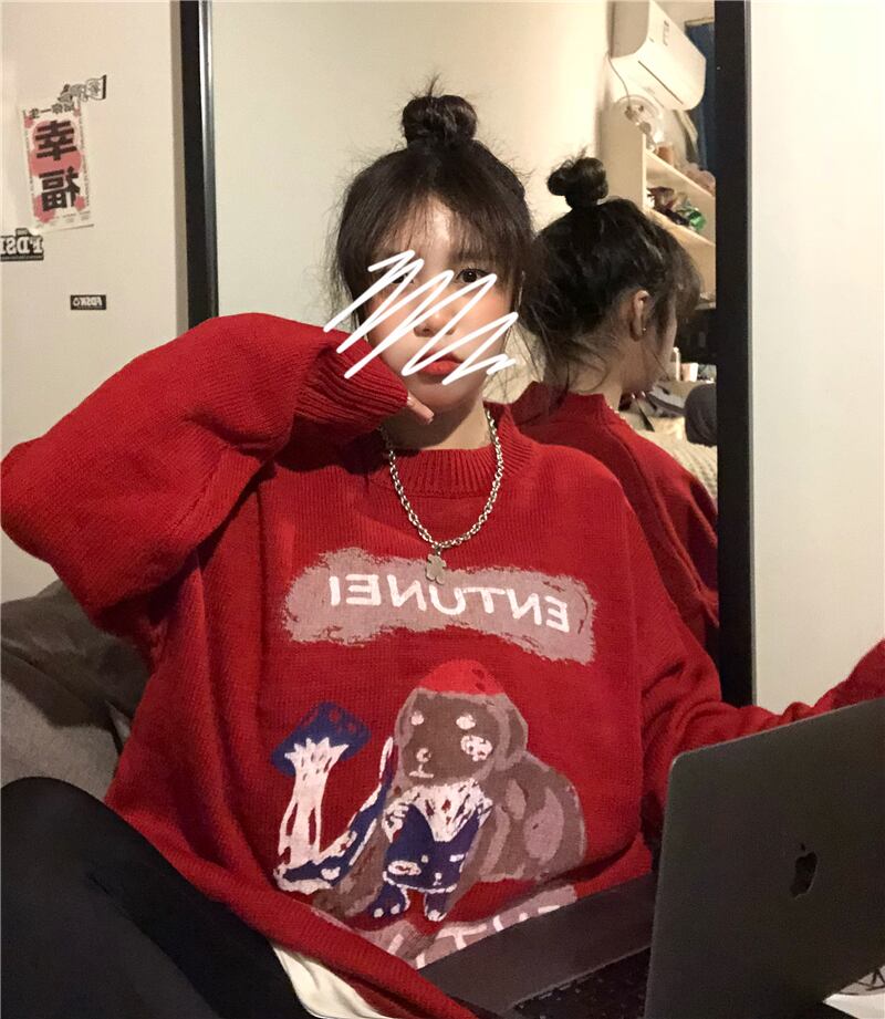 レッドセーター レディーススプリング韓国ファッショントレンドラウンドネックルーズニットトップス 春物 Oネック スタイル デーモン25374519137
