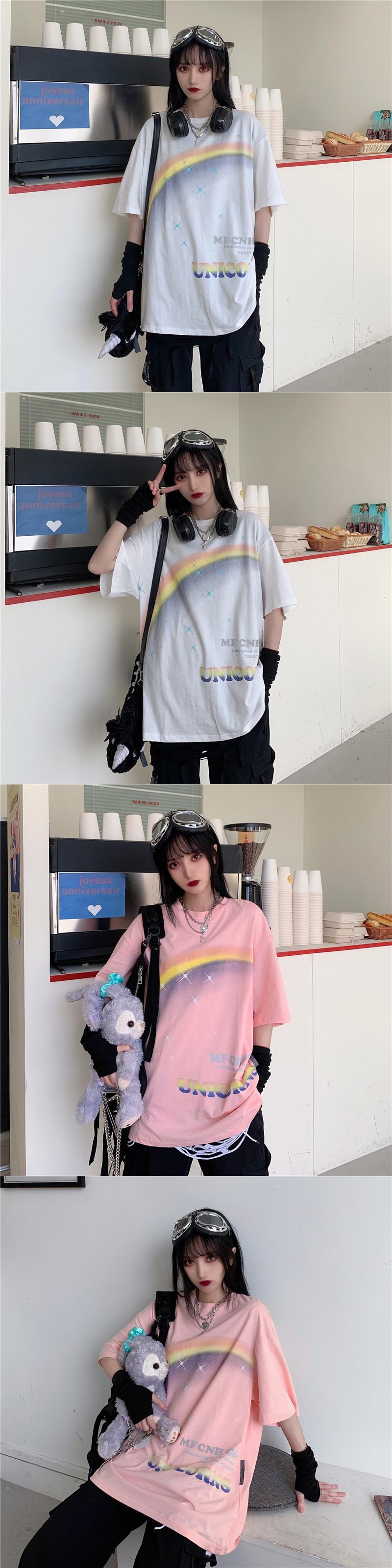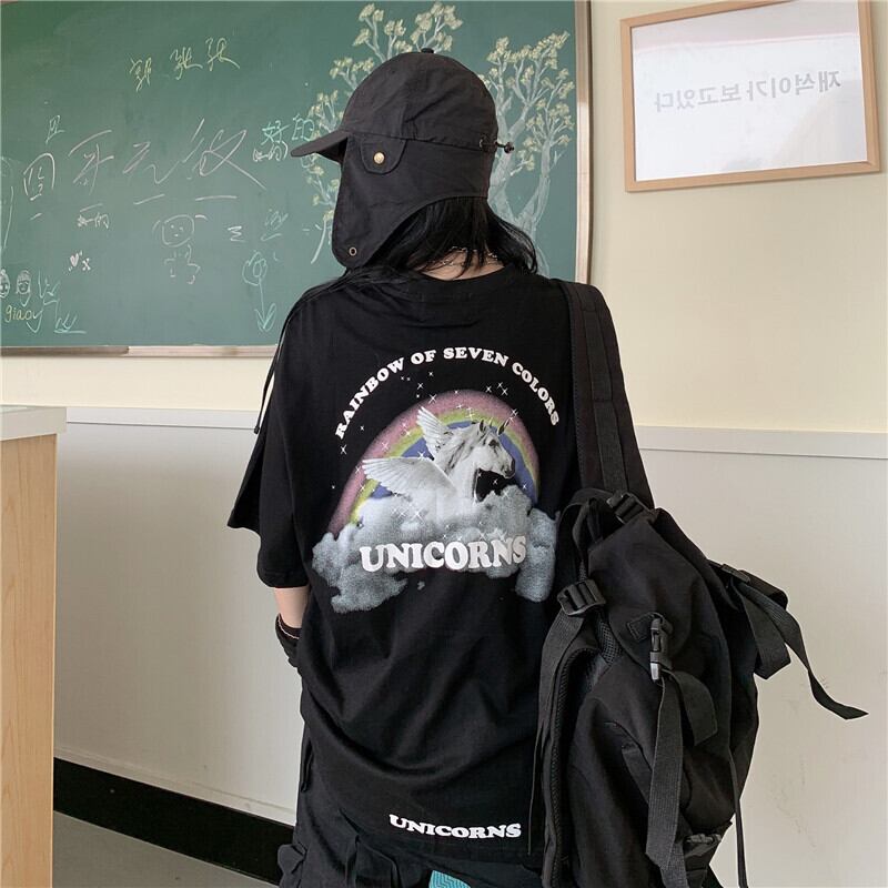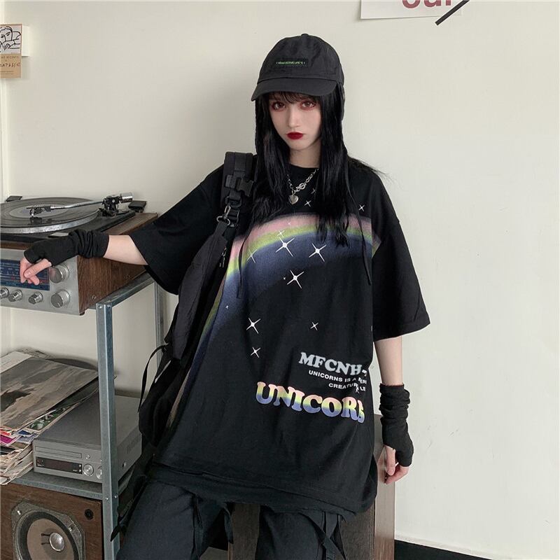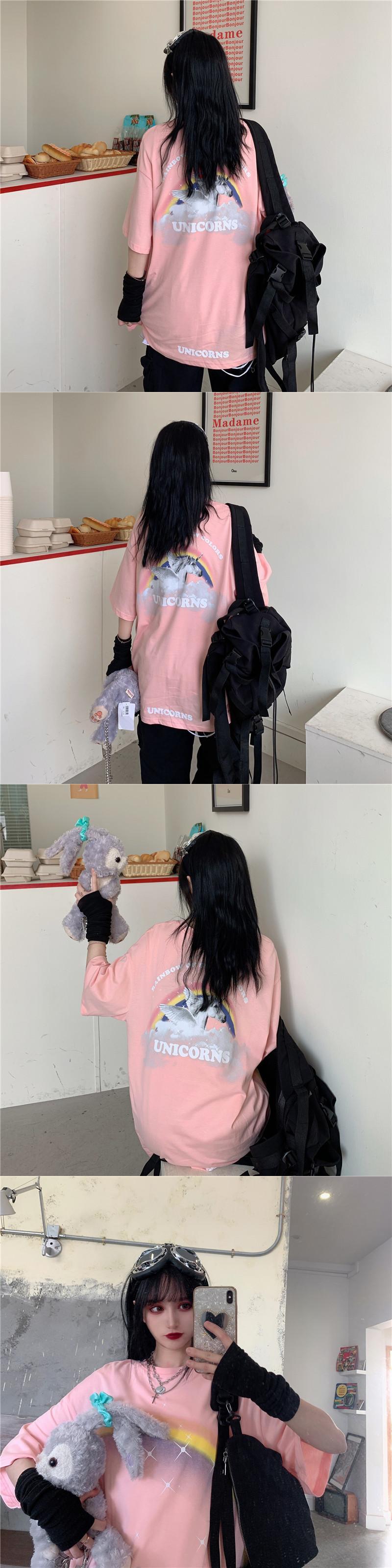 Tシャツレディーススプリング韓国ファッショントレンドスタイルプリントブラックルーズトップス 原宿 春物 ボーイズ デーモン59620916800