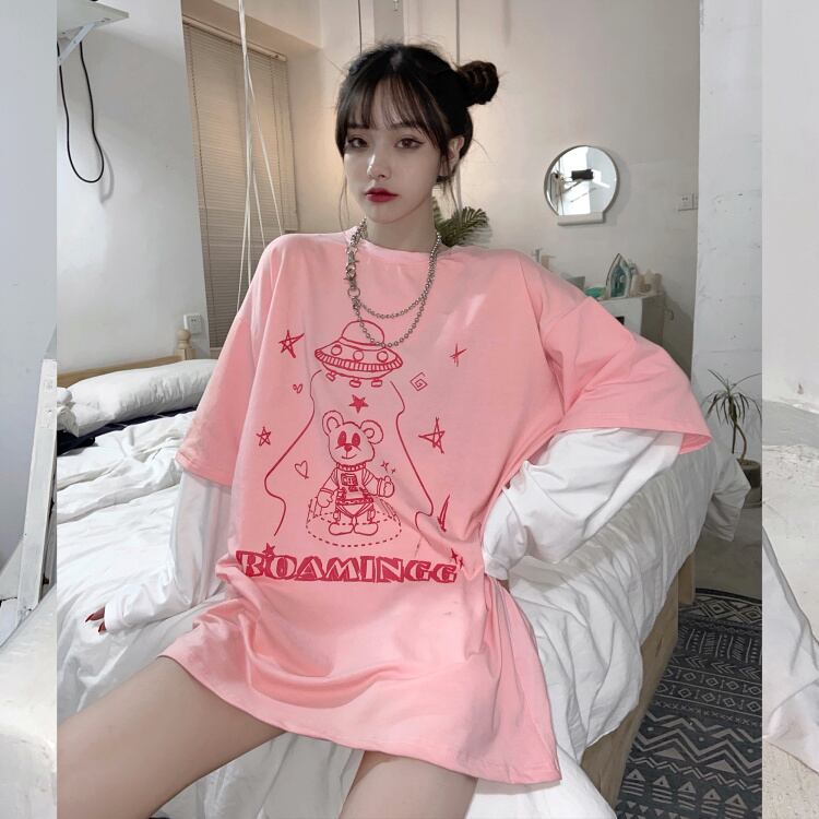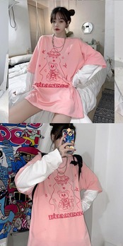 スプリングTシャツレディース韓国ファッショントレンドプリント柄ルーズトップス ロング 春物 ボーイズ スタイル 長袖 デーモン85113192892
