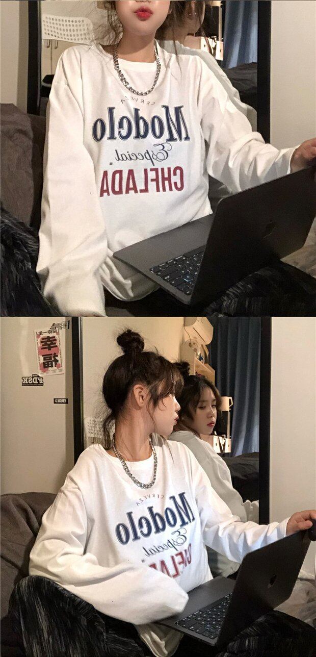 ホワイトTシャツシャツ ゆったりレディーススプリング韓国ファッショントレンドプリントルーズトップス ロング 春物 スタイル 長袖 デーモン90163444235