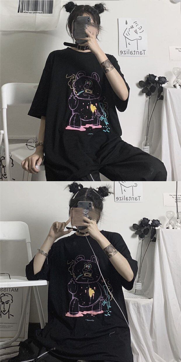 スリーブレディーススプリング韓国ファッショントレンドダークプリント柄ホワイトルーズTシャツ半袖トップス ハーフスリーブ 春物 スタイル デーモン72534802172