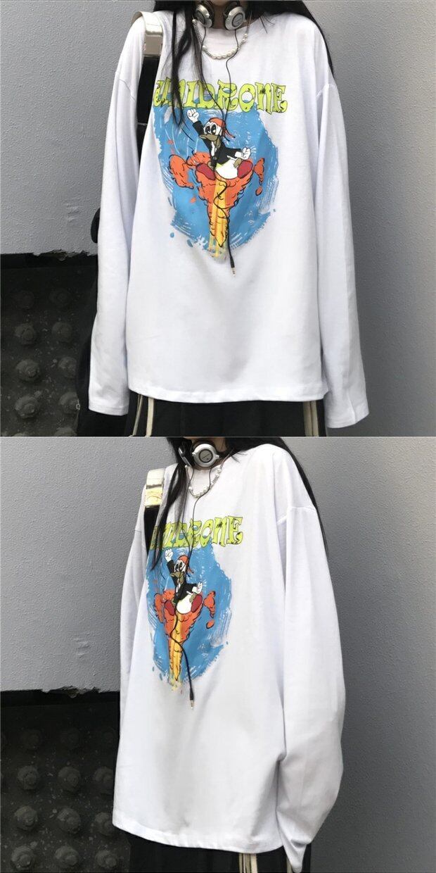 プリント柄Tシャツシャツ レディーススプリング韓国ファッショントレンドスタイルルーズゆったり ロング 原宿 春物 長袖 デーモン85929991538