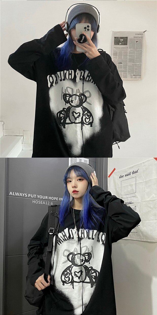Tシャツシャツ レディーススプリング韓国ファッショントレンドルーズブラックゆったりトップス ロング 春物 ボーイズ スタイル 長袖 デーモン983375247