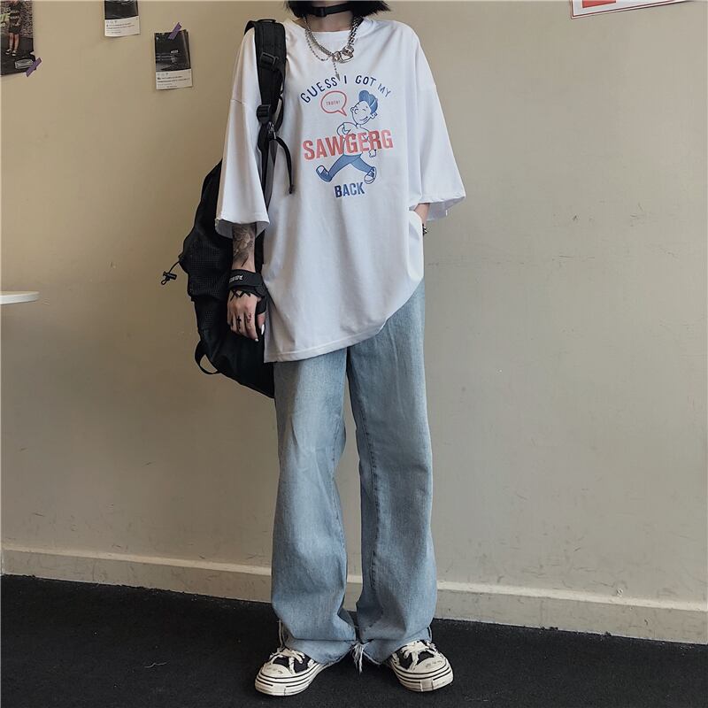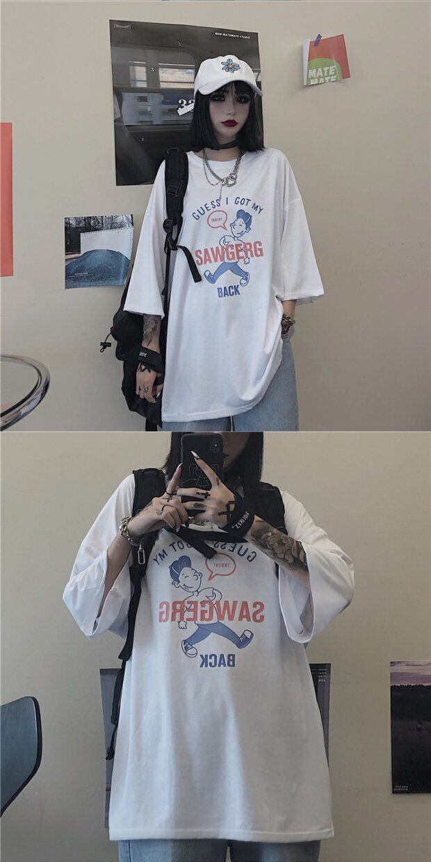 Tシャツレディーススプリング韓国ファッショントレンドプリントホワイトルーズトップス 春物 スタイル デーモン18096499430