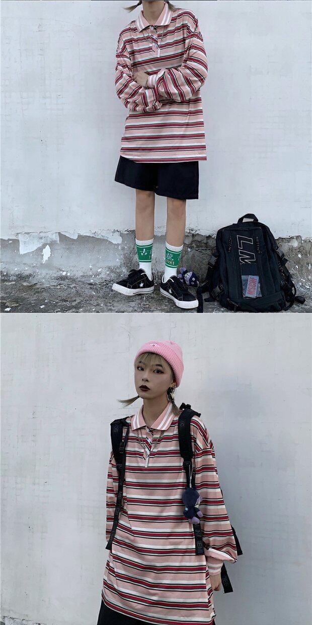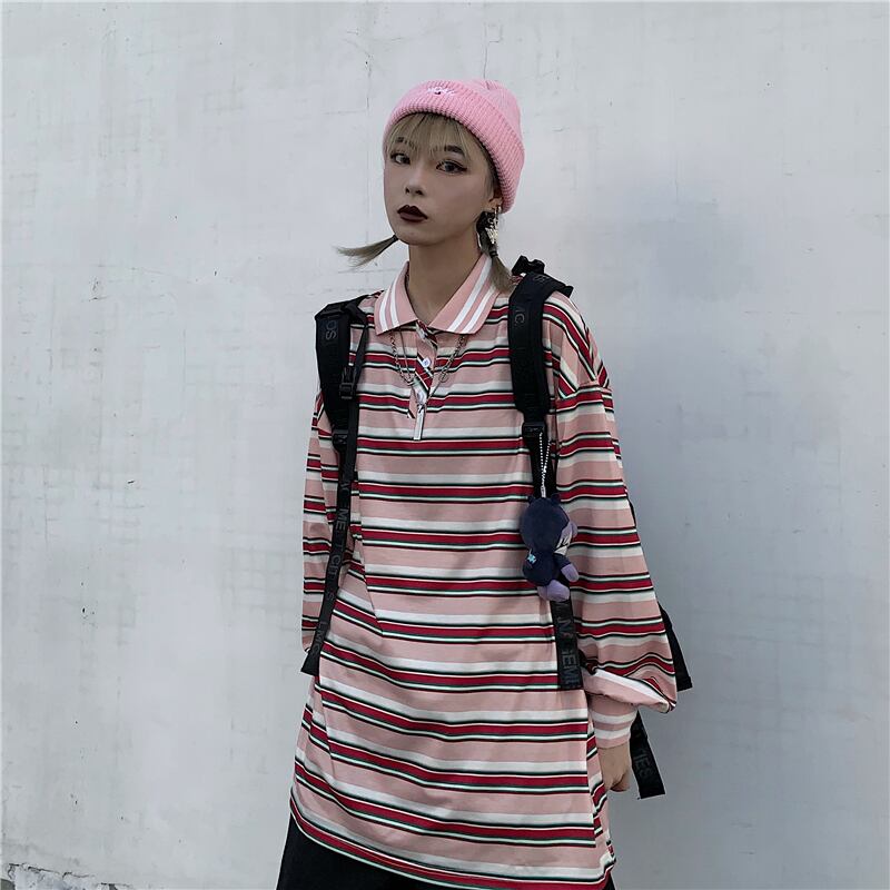 カラートップス レディーススプリング韓国ファッショントレンドストライプルーズゆったりシャツ Tシャツ ロング ピンク 春物 スタイル 長袖 デーモン58642356051