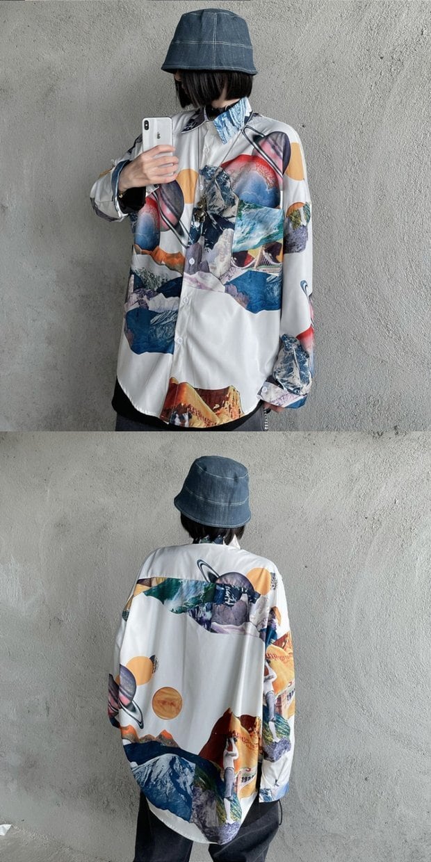 シャツ レディーススプリングプリントルーズカジュアルホワイトトップス ロング 春物 長袖 デーモン30619641562