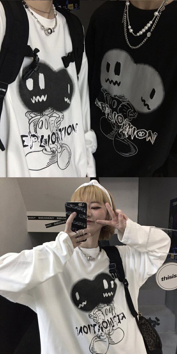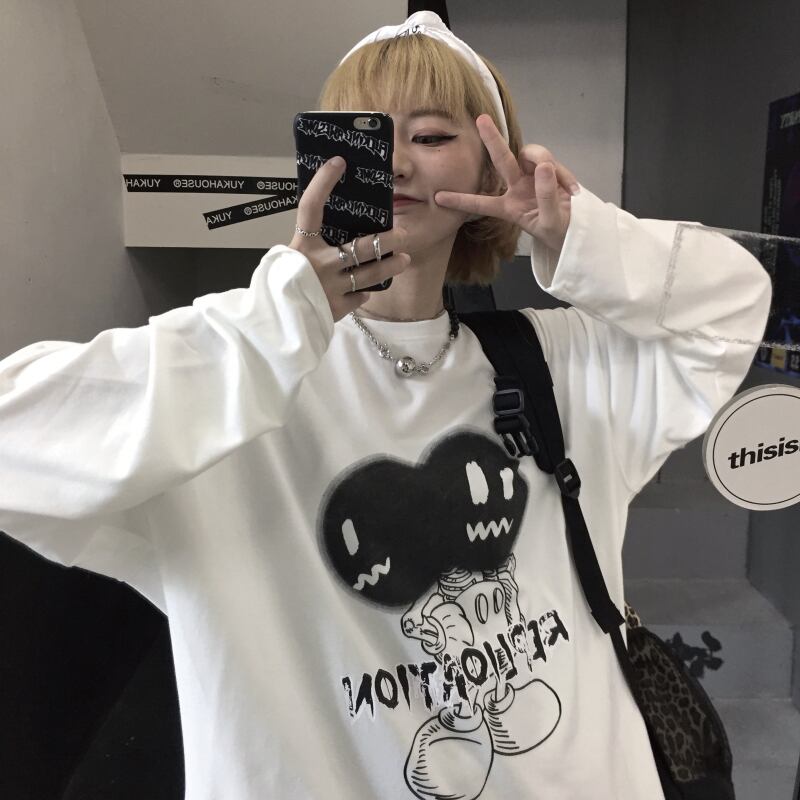 ゆったりシャツ スプリング韓国ファッショントレンドプリントルーズTシャツトップス レディース ロング 春物 スタイル 長袖 デーモン39689854364