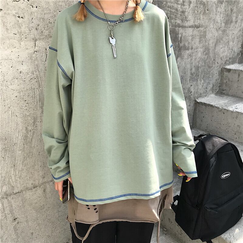 ゆったりシャツ スプリングレディース韓国ファッションラウンドネックルーズTシャツトップス ロング 春物 Oネック 長袖 デーモン34292193643