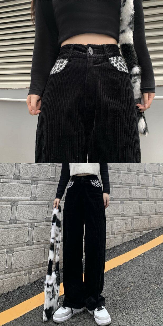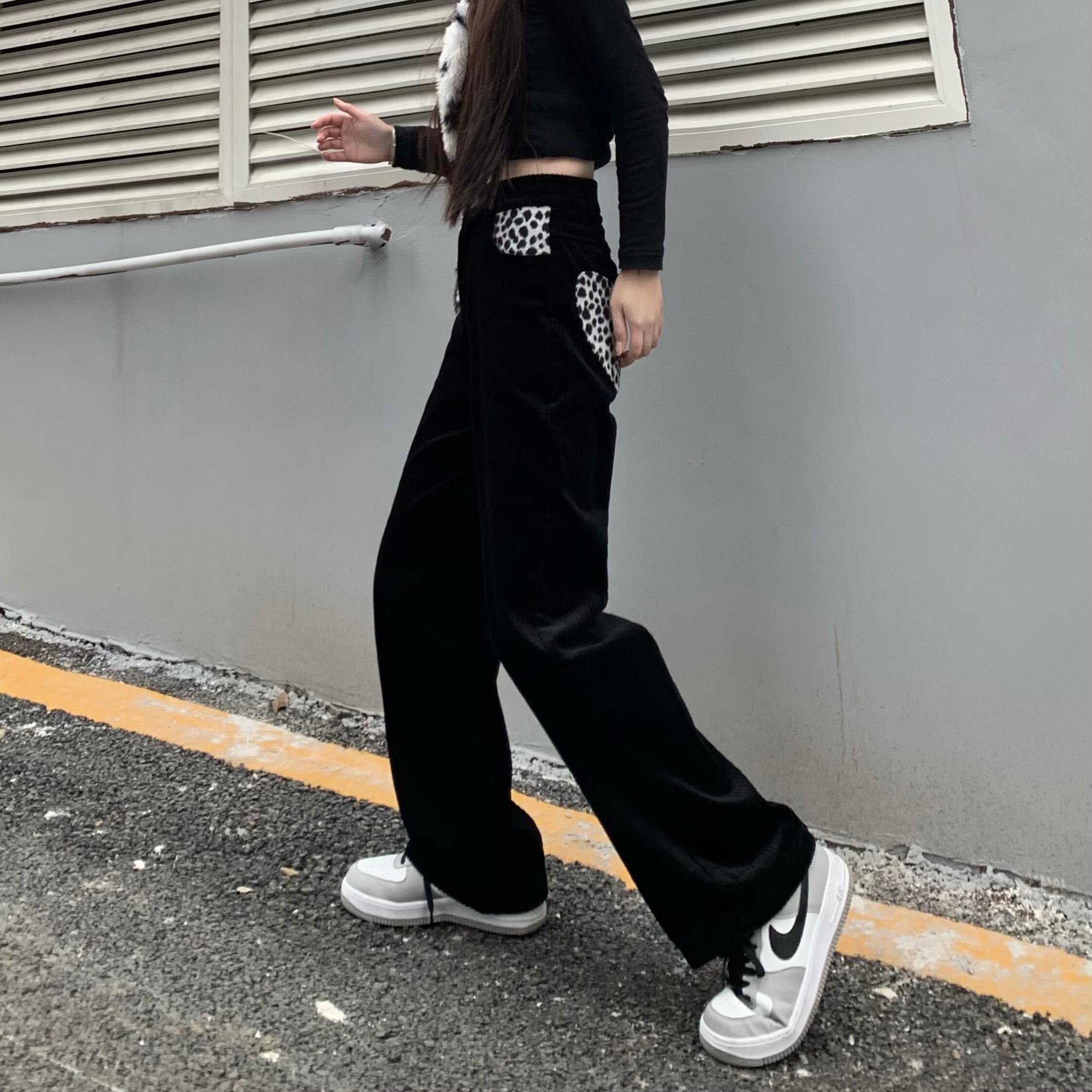 スプリングコーデュロイパンツ レディース韓国ファッショントレンドレオパードパターンルーズハイウェストウェストカジュアル 春物 ステッチ スタイル ウエスト デーモン44363488469