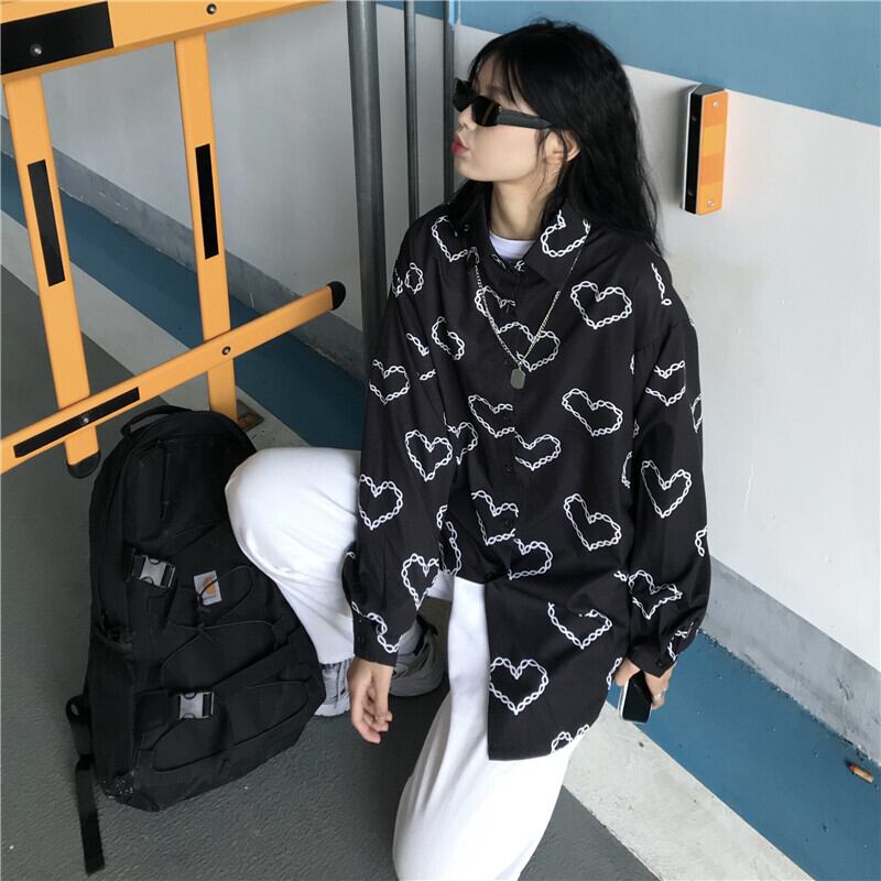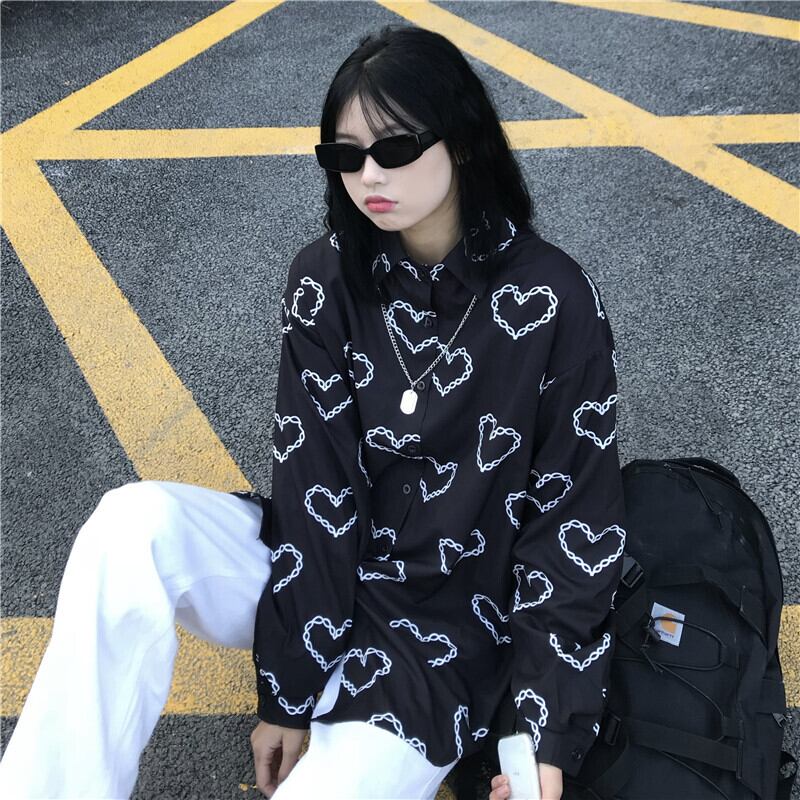 ブラックシャツ レディーススプリング夏服スタンダードスタイルダークプリントルーズ ロング レトロ 原宿 春物 夏物 長袖 CHIL26857199015