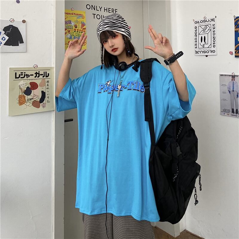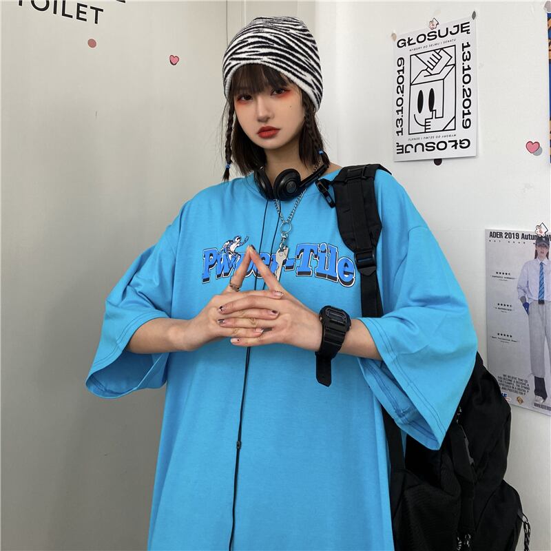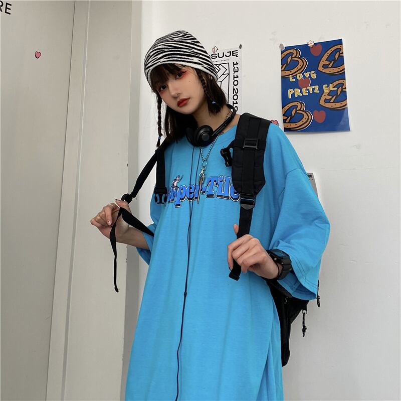 ブルーTシャツレディーススプリング韓国ファッショントレンドプリントルーズトップス 原宿 春物 スタイル デーモン29647325465