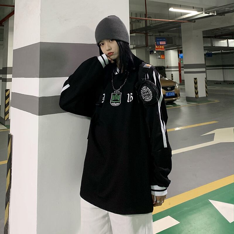 Tシャツレディーススプリング韓国ファッショントレンドVネックルーズブラックゆったりトップス ロング 春物 スタイル 長袖 デーモン3059201326
