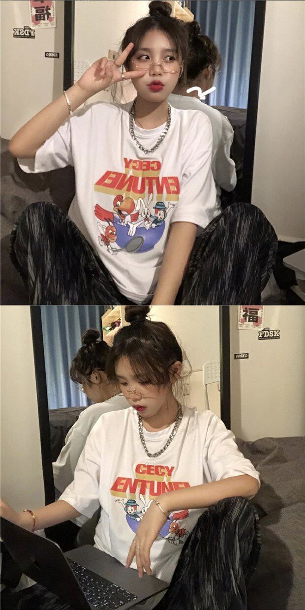 Tシャツレディーススプリング韓国ファッショントレンドプリントホワイトルーズトップス 大人ガーリー スウィート キュート カジュアル 春物 スタイル デーモン2310482256