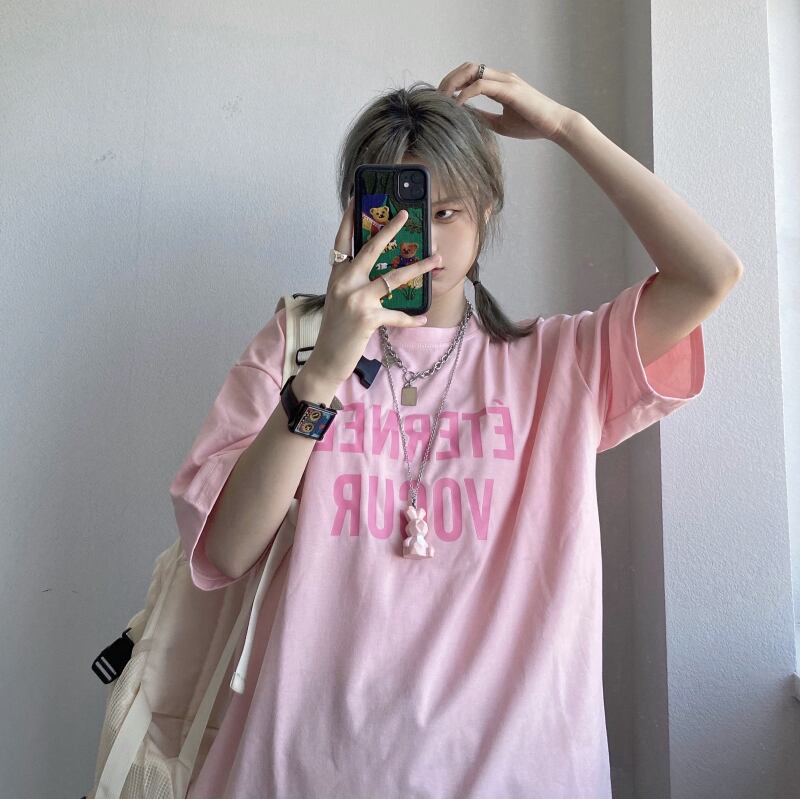 ラウンドネックTシャツレディース夏服韓国ファッショントレンドプリントルーズゆったりトップス ピンク 夏物 Oネック スタイル デーモン23982224188