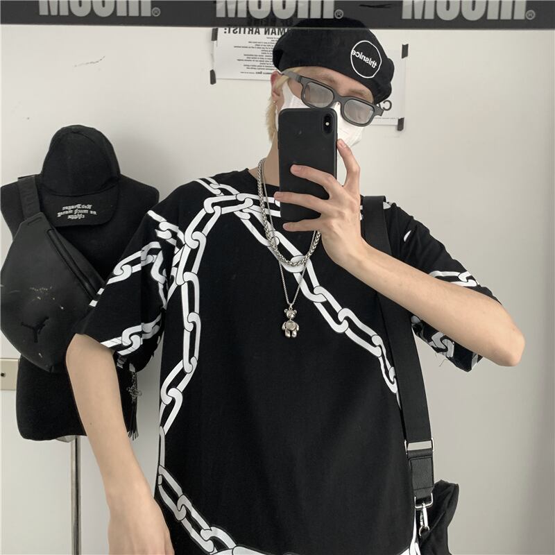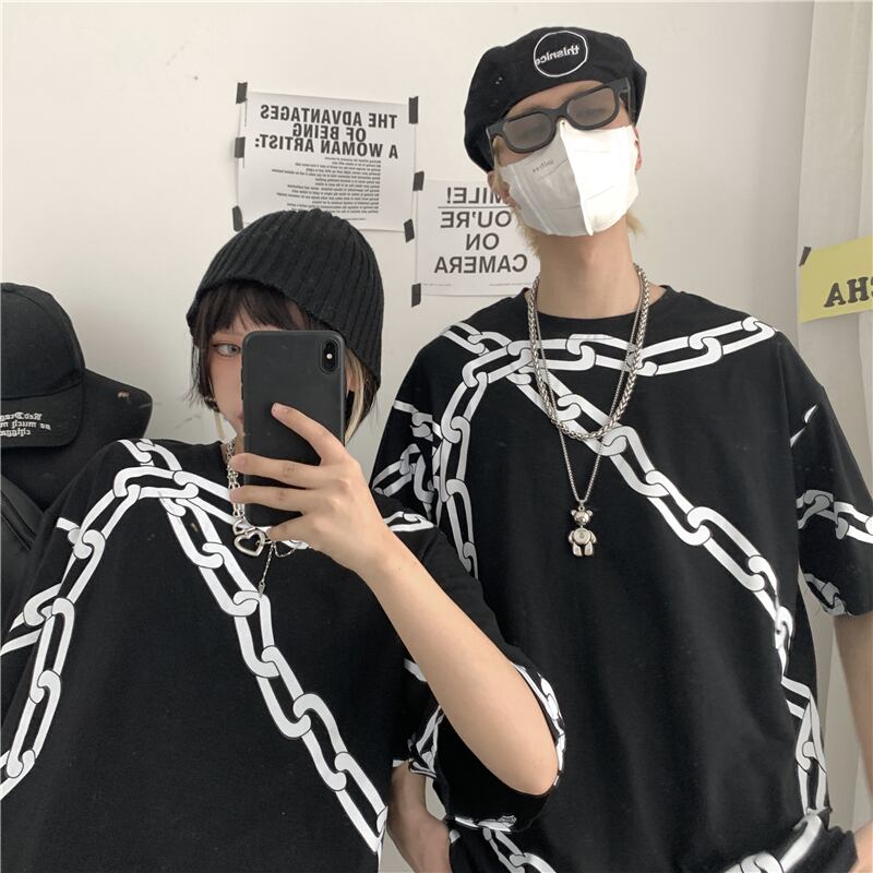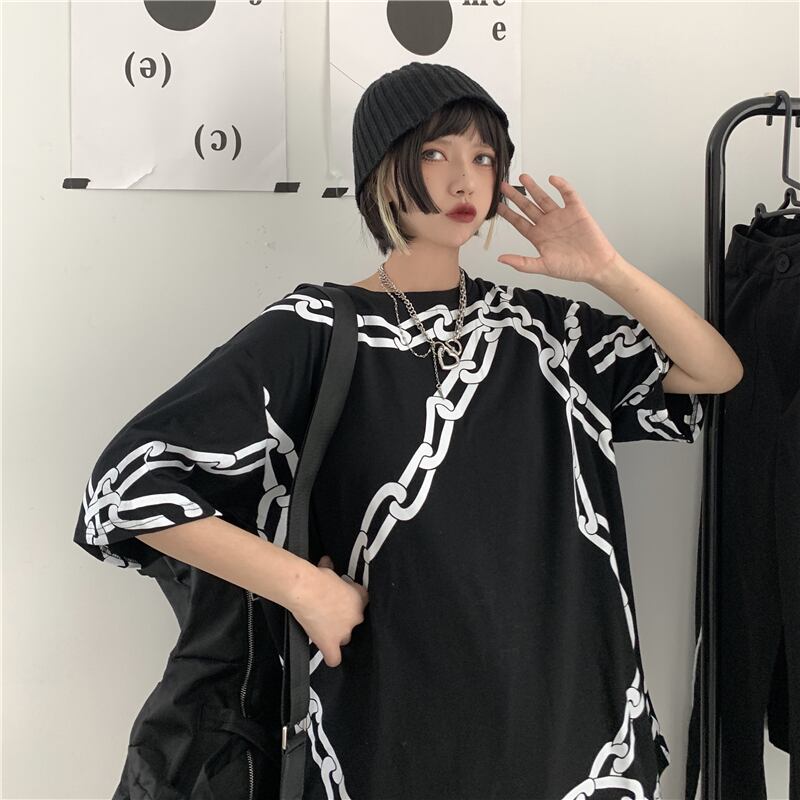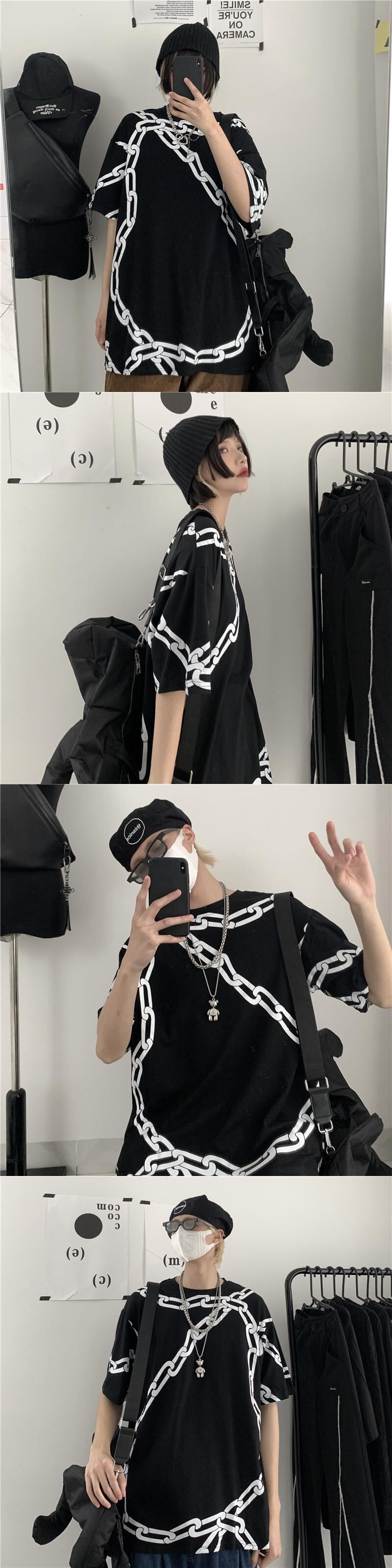Tシャツシャツ レディース夏服ダークブラックカジュアルルーズチェーン プリント 夏物 ボーイズ CHIL89295940238
