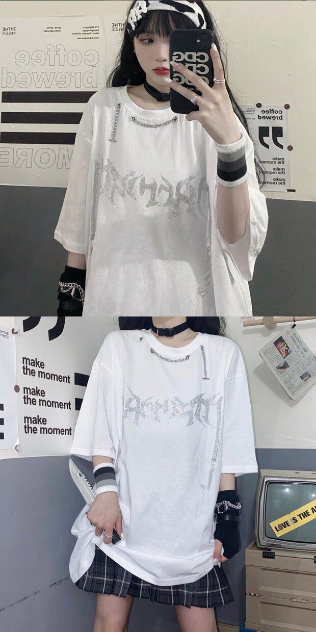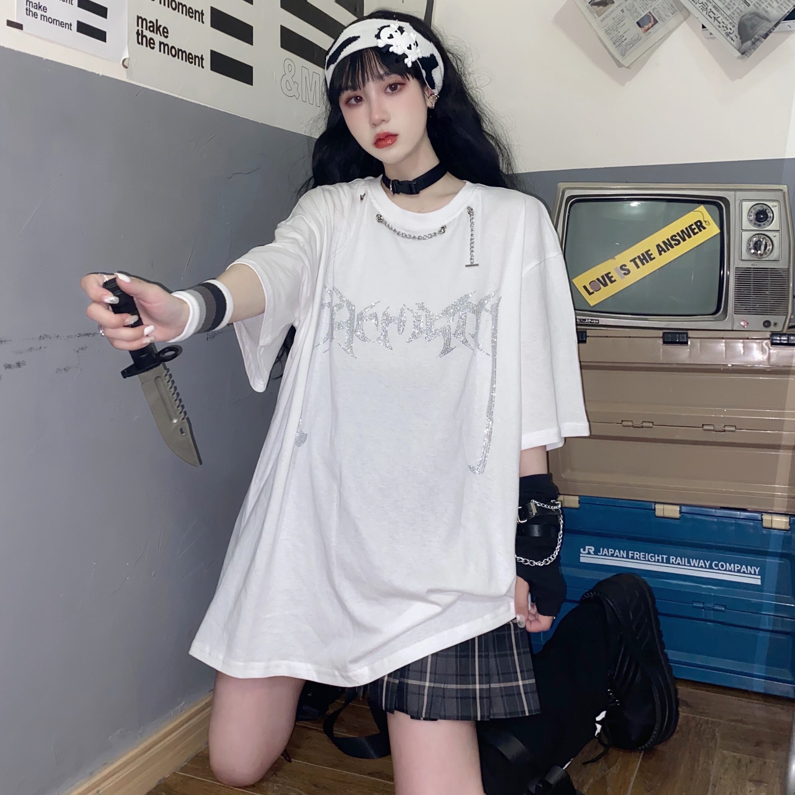 スタイルTシャツレディース夏服韓国ファッショントレンドチェーン ルーズホワイトトップス 原宿 夏物 ボーイズ デーモン63973012612