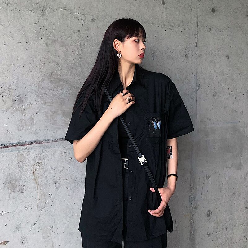 夏服ブラックシャツ レディーススタイルダークスタンダードButterflyデザイン ポケット レトロ 原宿 夏物 CHIL54137866046
