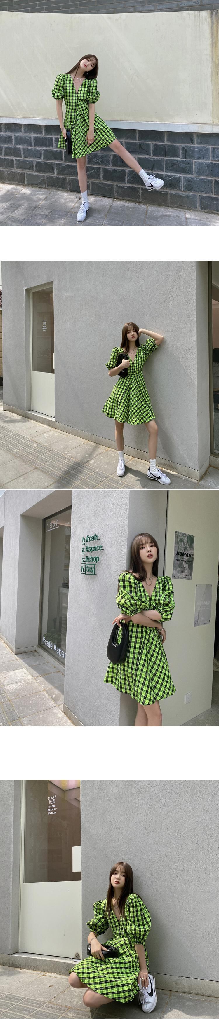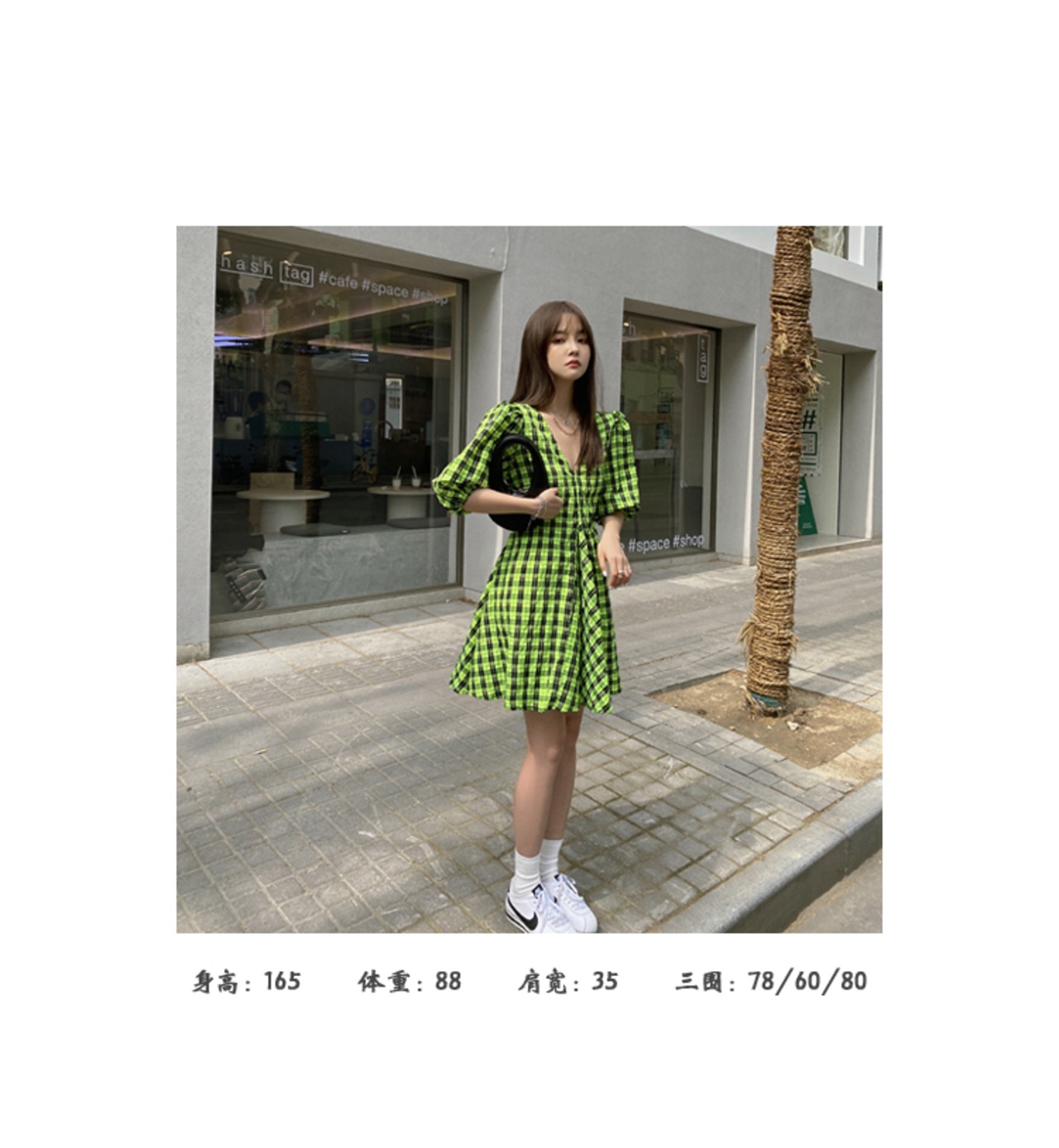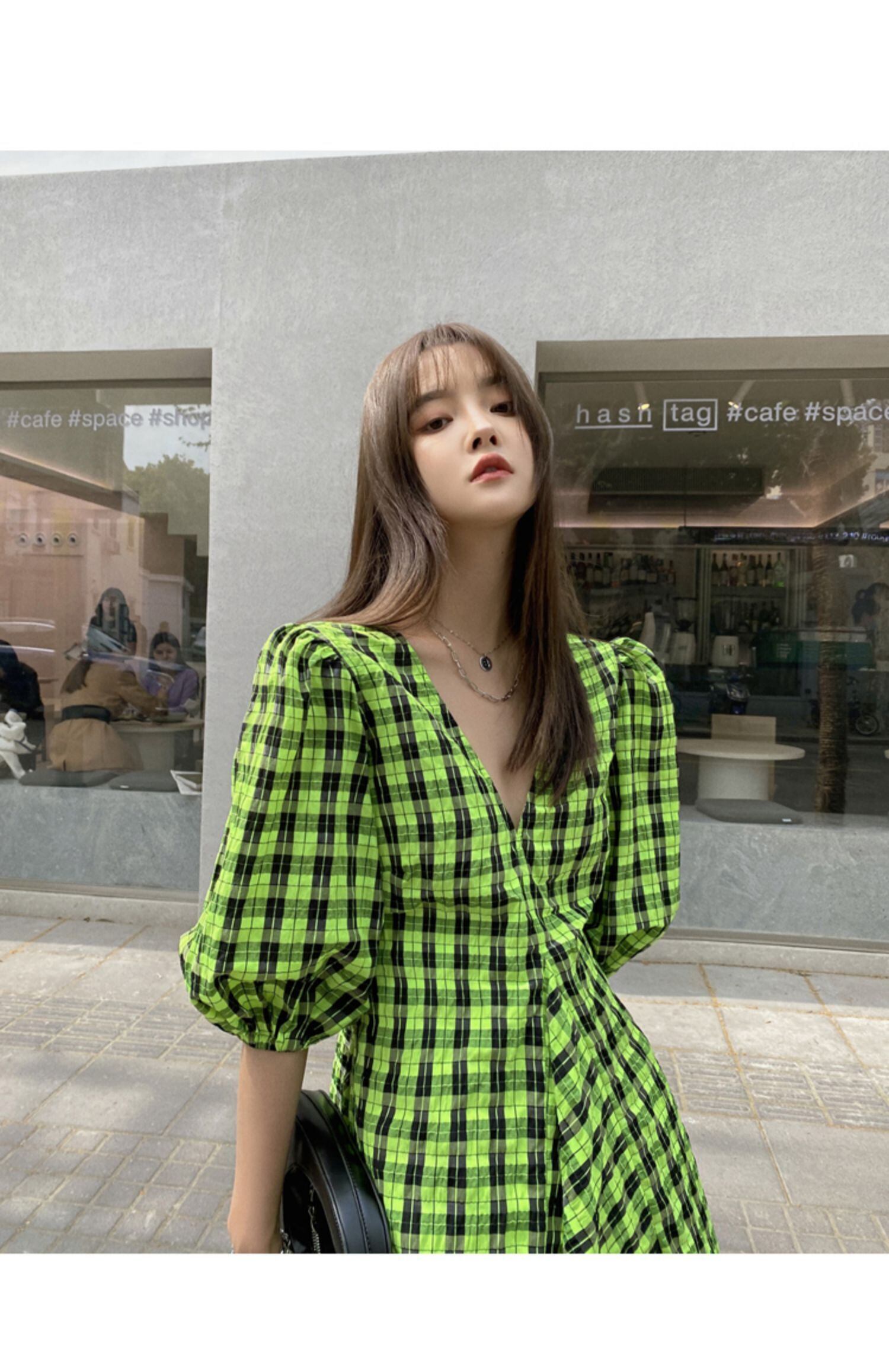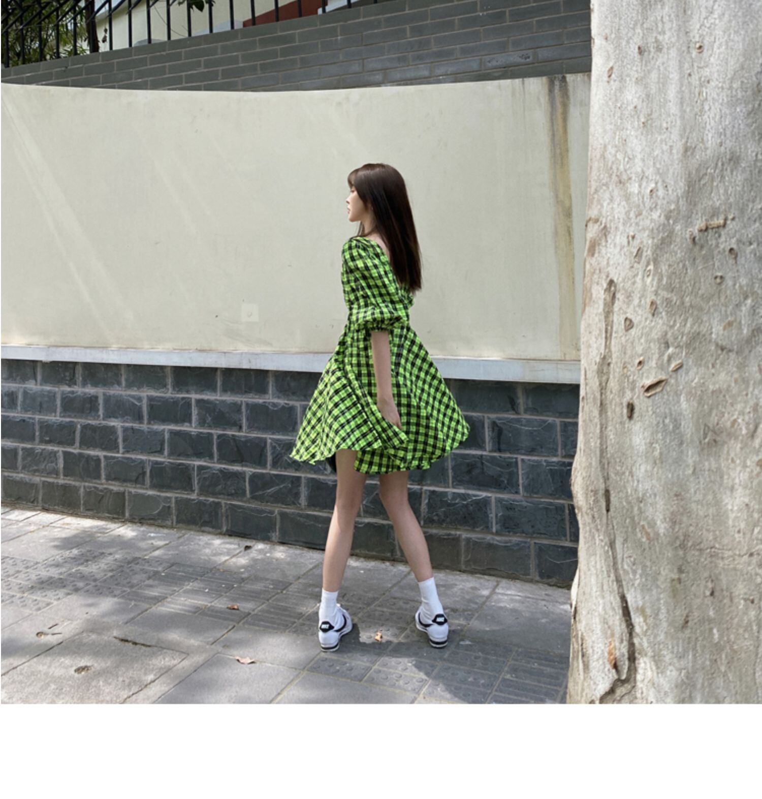 夏服グリーン格子柄Vネックルーズスカート ワンピースショート韓国ファッションAライン 夏物 パフスリーブ CHIL92522614049