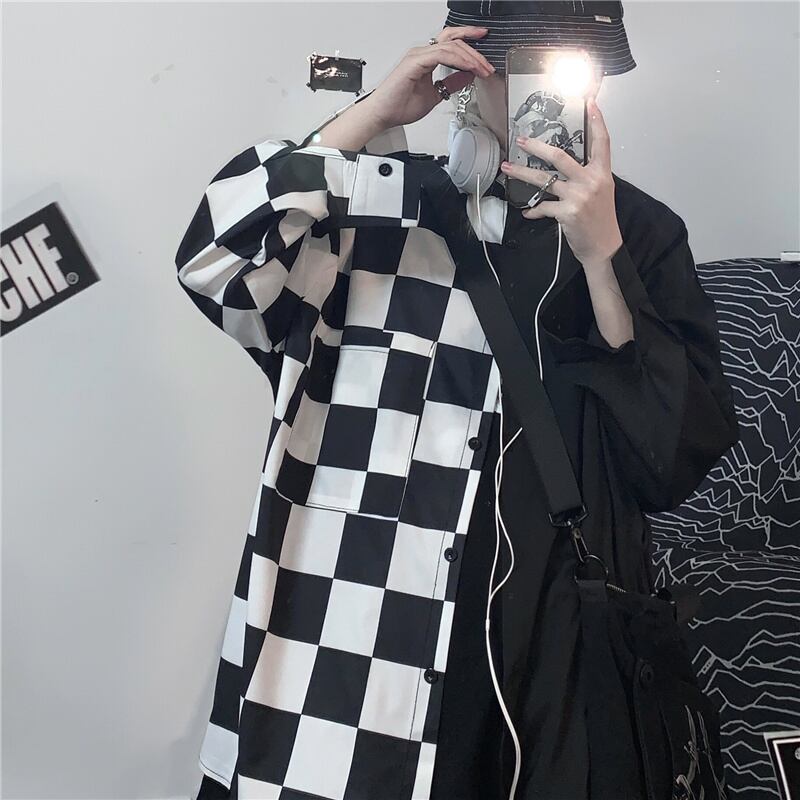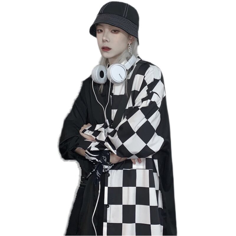 スプリングシャツ レディース韓国ファッションスタイル格子柄ルーズカジュアル ロング 春物 ステッチ 長袖 デーモン92732009695