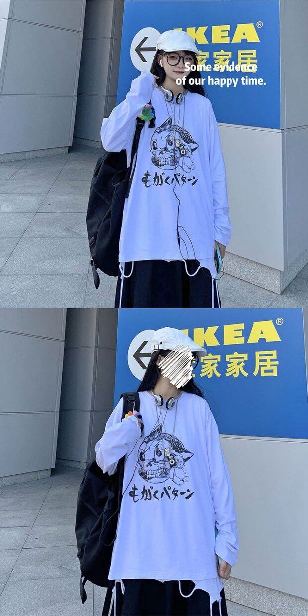 Tシャツレディーススプリング韓国ファッショントレンドダークプリントブラックルーズゆったりトップス ロング 春物 スタイル 長袖 デーモン13610968984