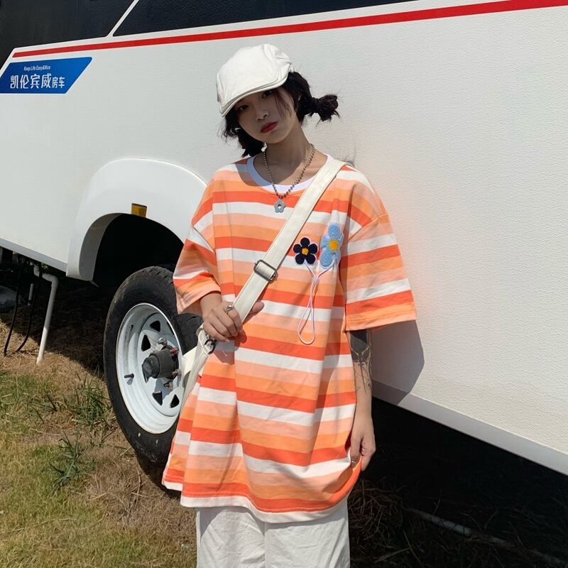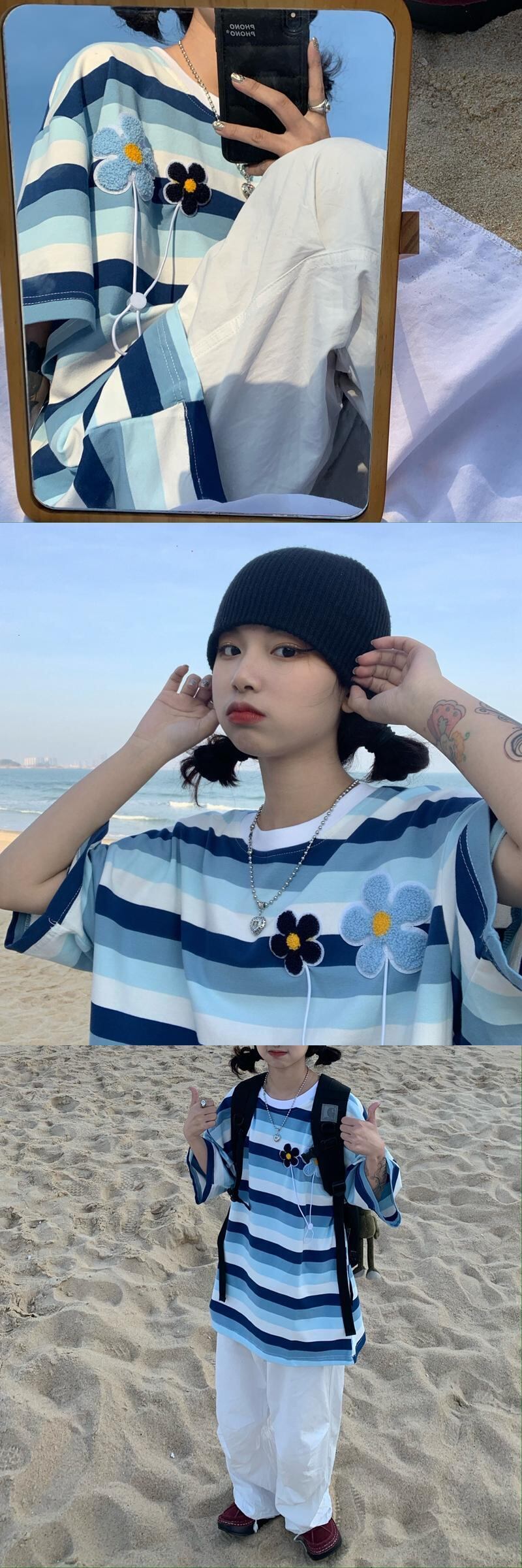 ジャケット レディーススプリング韓国ファッショントレンドルーズストライプTシャツ 春物 フラワーデザイン ボーイズ デーモン70267680670