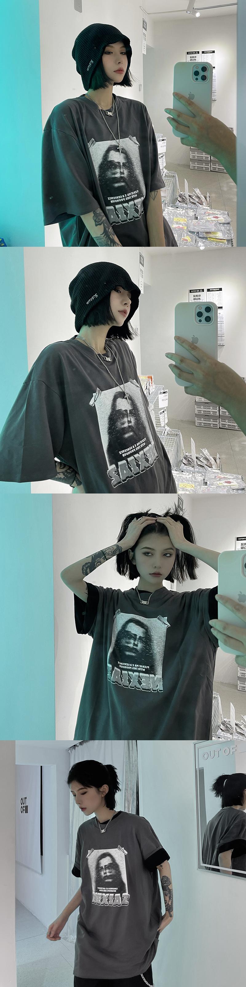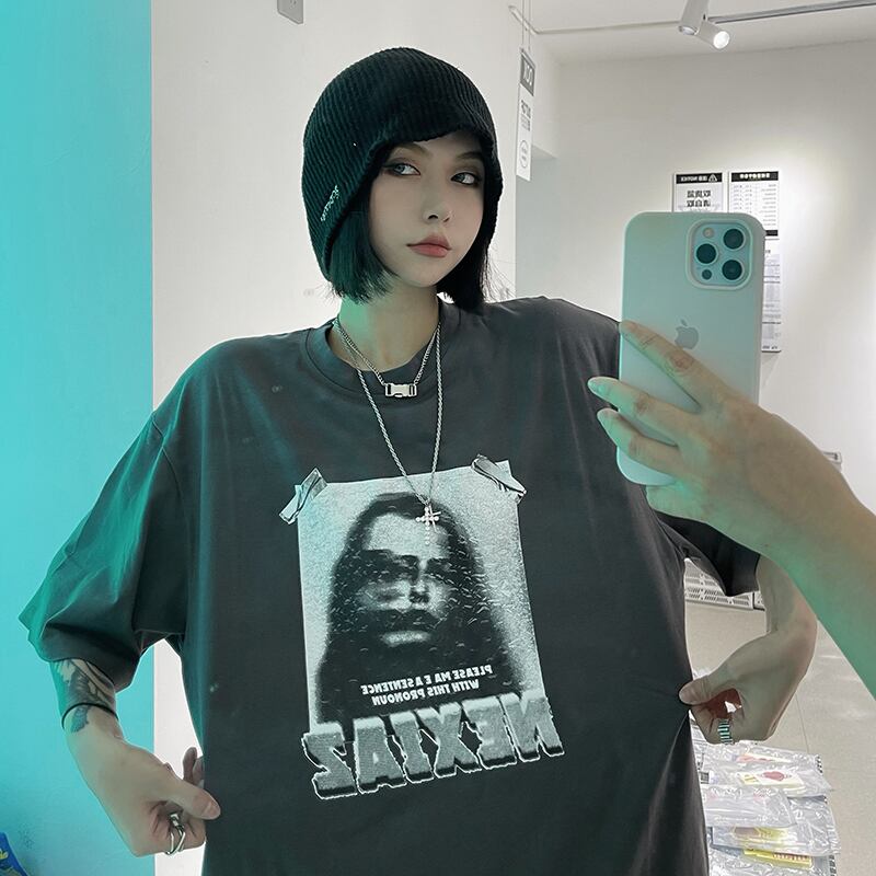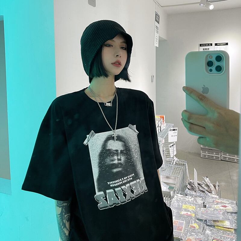 ブラックTシャツトップス レディース夏服韓国ファッショントレンドダークスタンダードプリントルーズ レトロ 夏物 スタイル デーモン64029922653