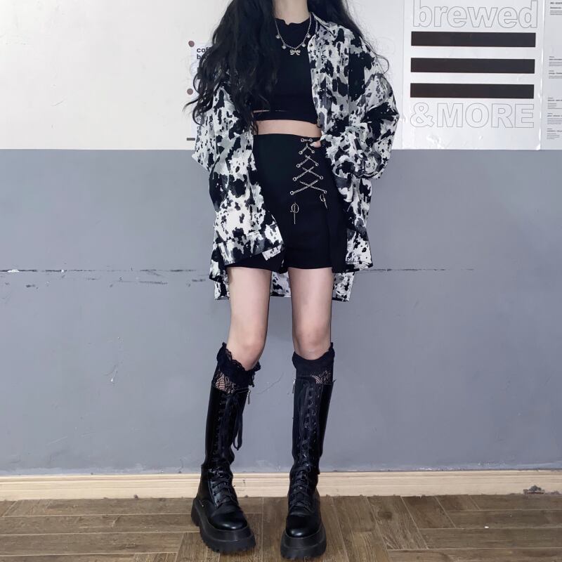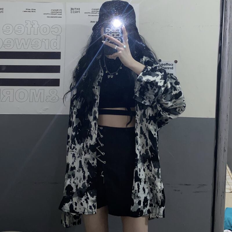 スタイルルーズシャツ レディーススプリング韓国ファッショントレンドブラックホワイトプリントジャケット ロング 春物 長袖 デーモン7793794812