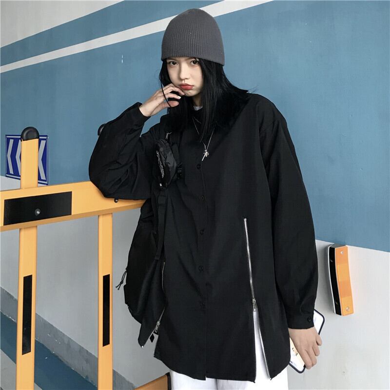 シャツ レディーススプリング韓国ファッションジッパーブラックルーズカジュアルトップス ロング 春物 長袖 デーモン21758589559