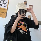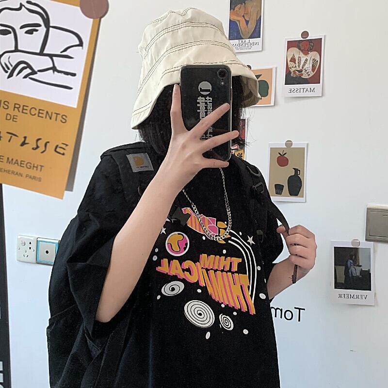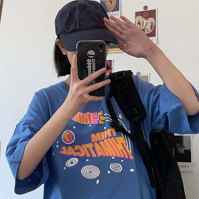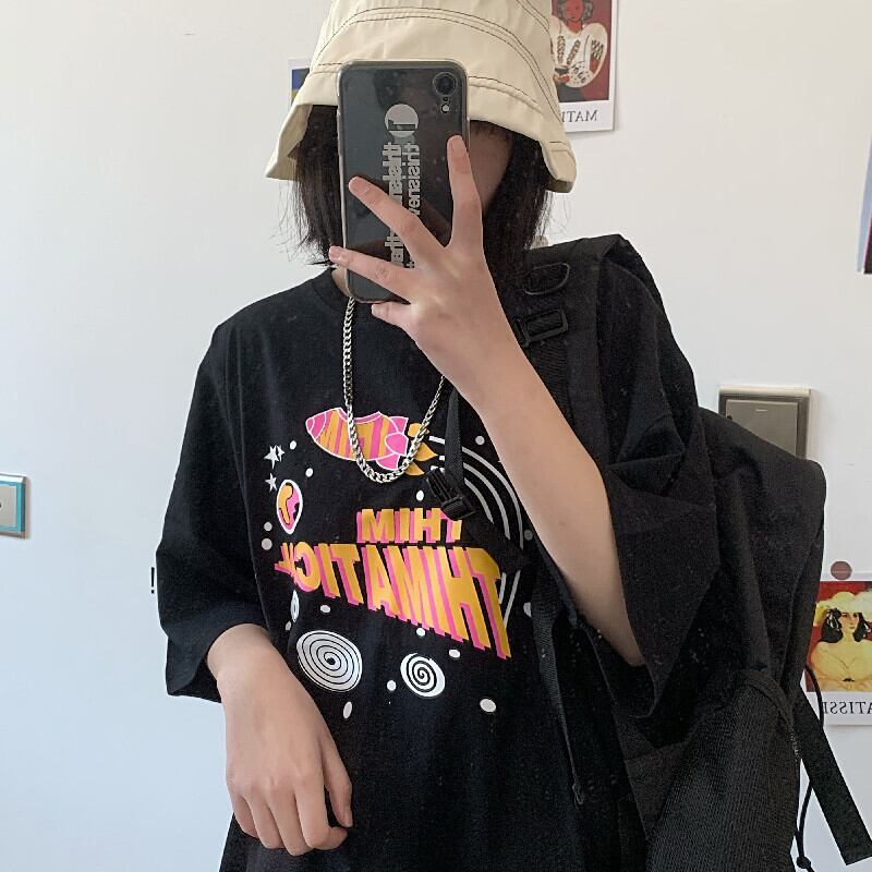 Tシャツレディース夏服韓国ファッショントレンドスタンダードプリントルーズブラックトップス レトロ 夏物 スタイル デーモン34797430815