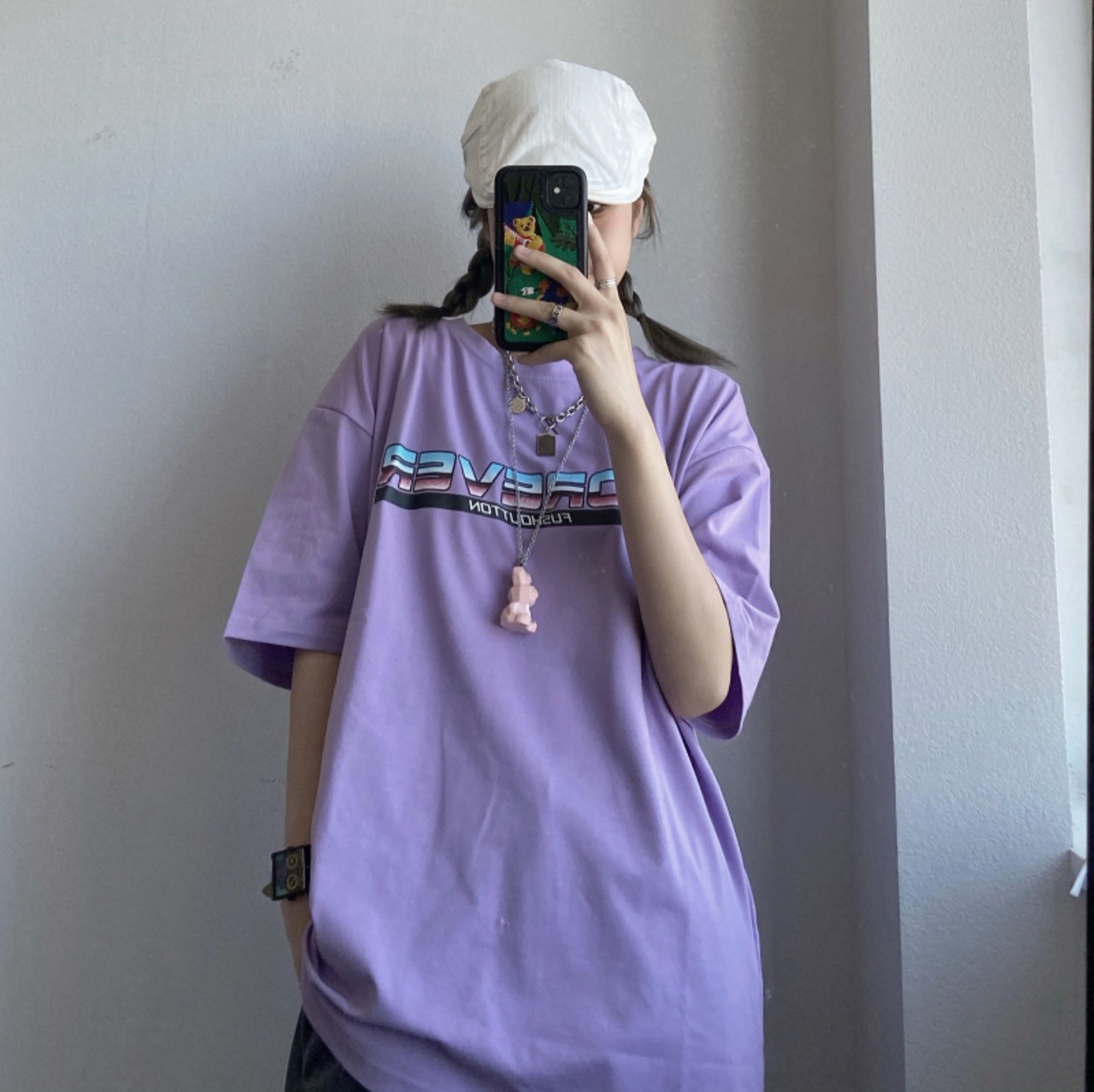 夏服スタイルスタンダードプリントカジュアルルーズTシャツレディース レトロ 原宿 夏物 パープル CHIL20043853335