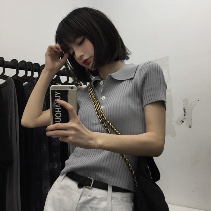夏服スタンダードカラーニットショートTシャツスリムトップス レトロ 夏物 CHIL59893450696
