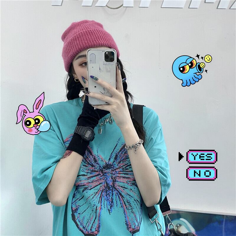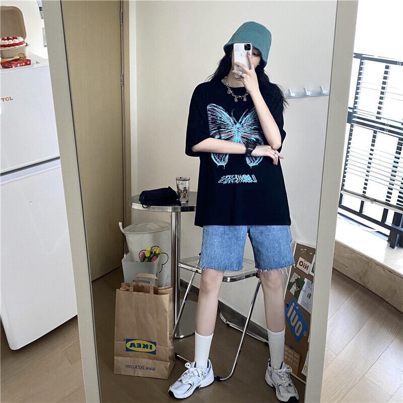 ブラックTシャツレディース夏服韓国ファッショントレンドButterflyデザイン プリント柄ルーズメンズトップス ショート 半袖 ハーフスリーブ 夏物 CHIL2629129025