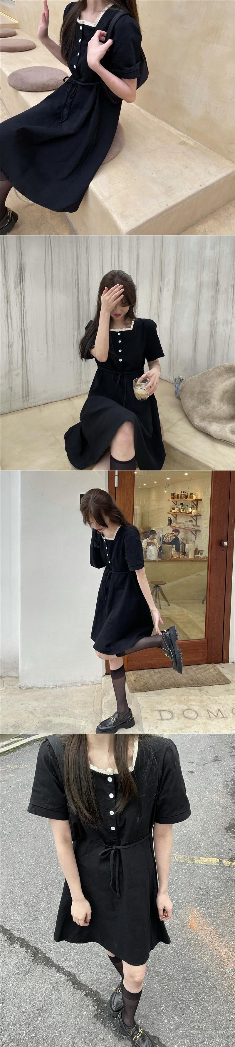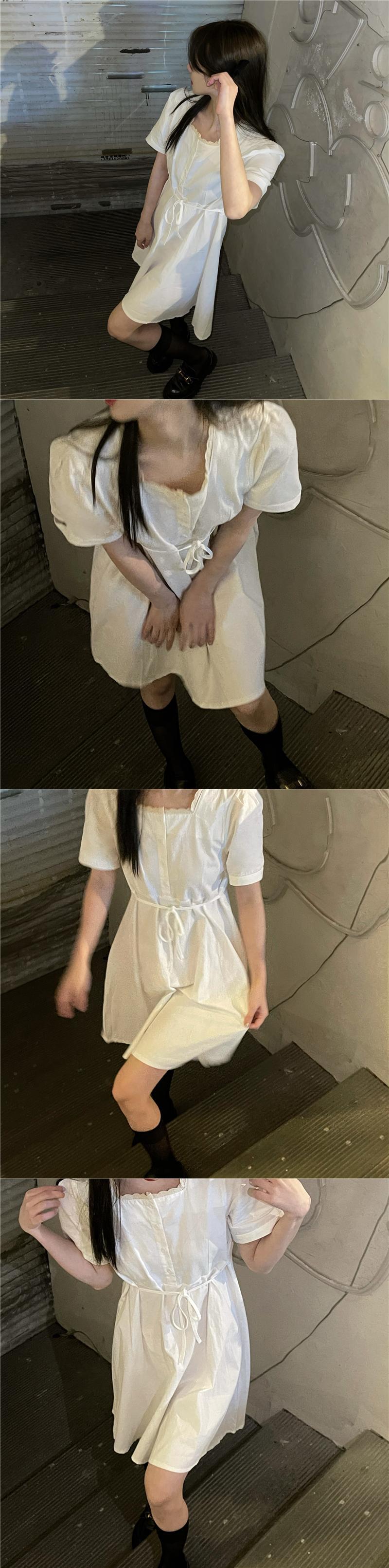 ホワイトワンピースレディース夏服韓国ファッションスタイルレースカラー半袖スリーブAラインスカート ハイウェストウェストスリム ショート ハーフスリーブ 夏物 スクウェア ウエスト CHIL14221028387