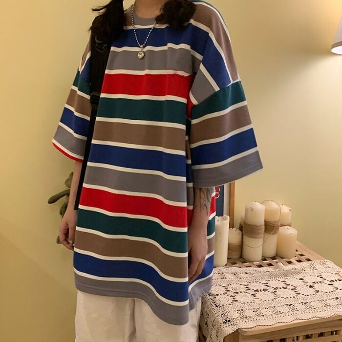 ストライプTシャツシャツ レディース夏服ルーズ韓国ファッショントレンドスタイル 原宿 夏物 CHIL72765395956