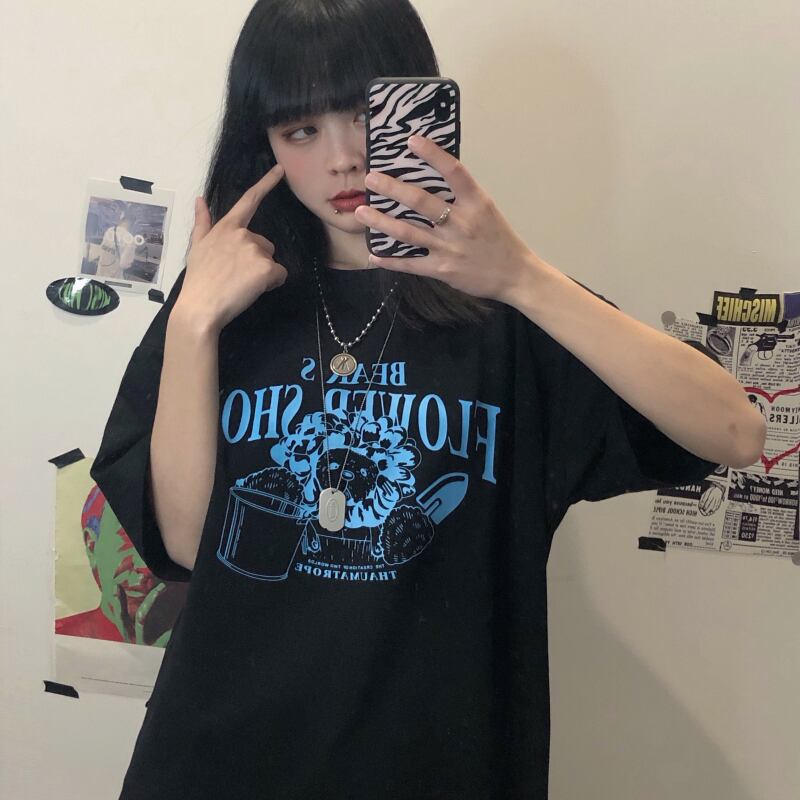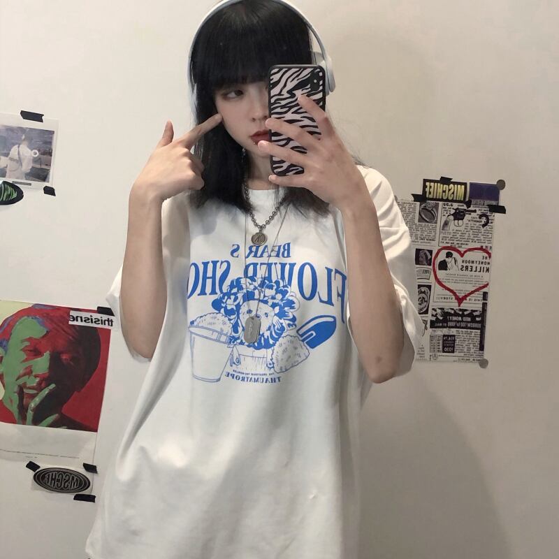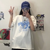 夏服韓国ファッショントレンドスタイルスタンダードプリント柄ルーズカジュアルTシャツレディース レトロ 夏物 CHIL48813616259